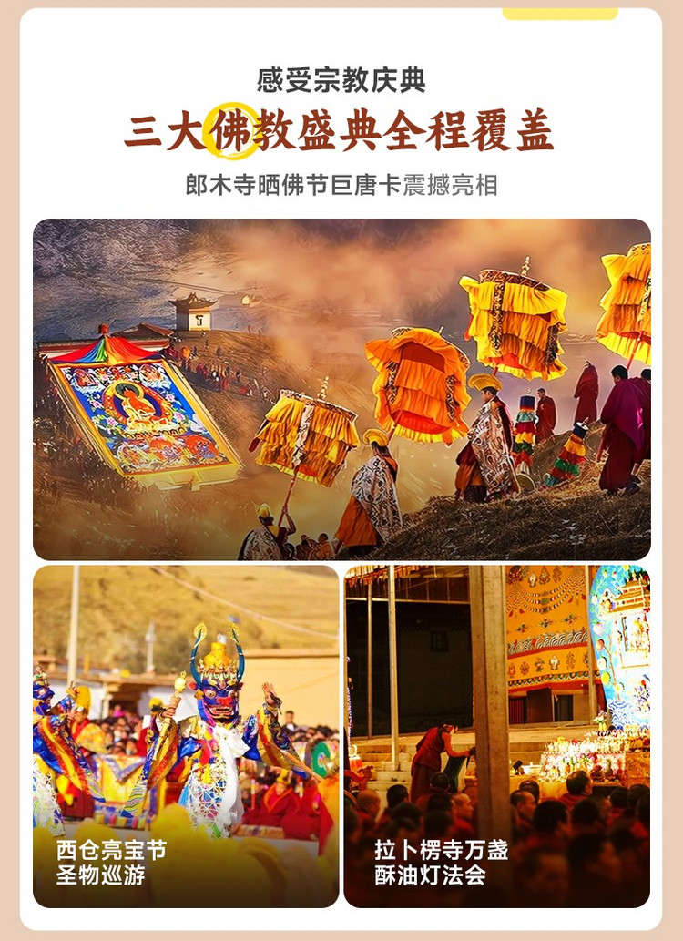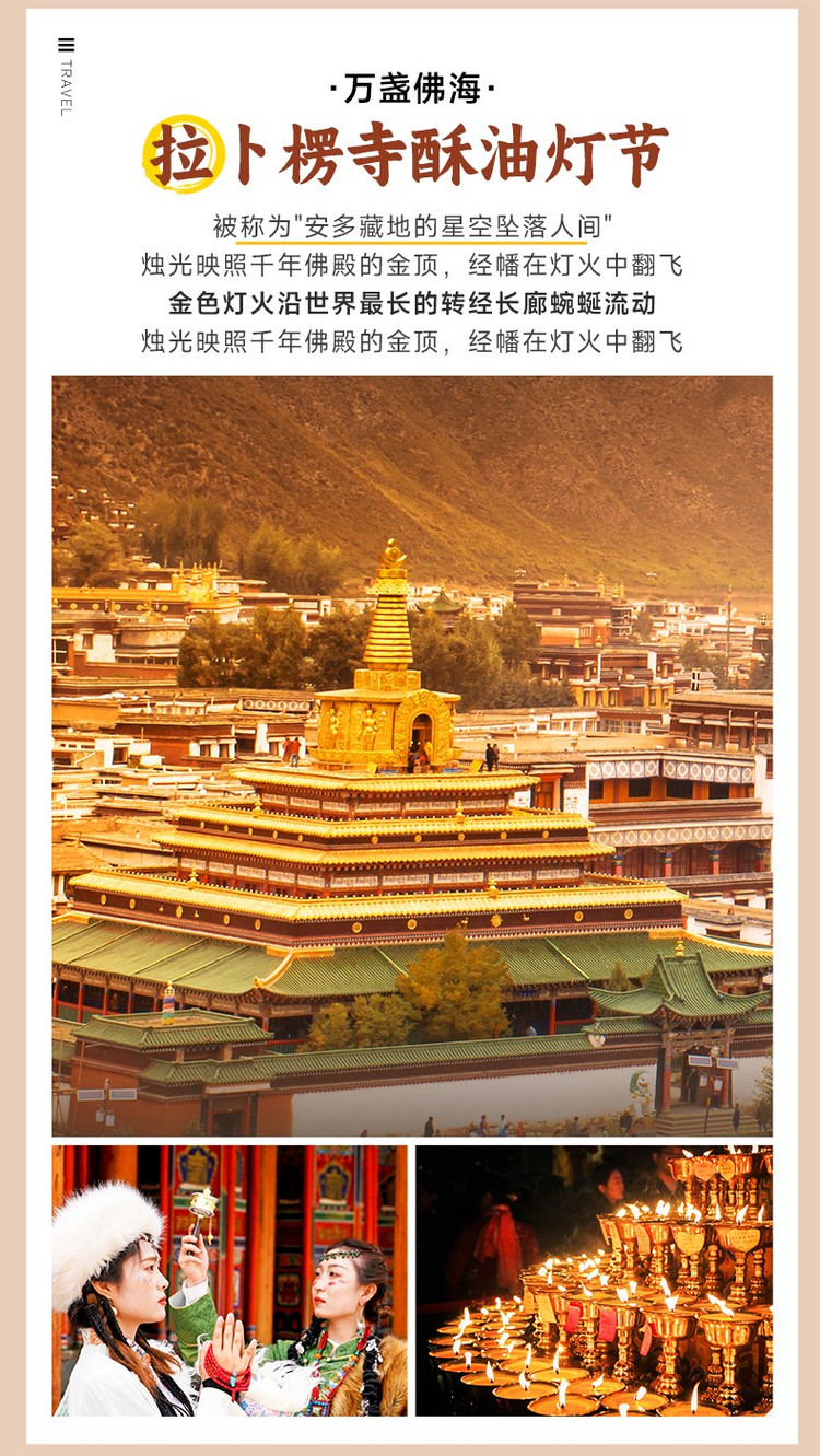 游玩结束后前往夏河酒店办理入住,傍晚步行前往拉卜楞寺参加【酥油灯法会】,傍晚的法会渐入佳境,大经堂周围陈列着僧人用冰手制作的酥油花,佛像、花卉造型栩栩如生,在冷空气中更显精致。天色渐暗时,万盏酥油灯依次点亮,暖黄的灯光映着雪夜,信徒们手捧哈达排队朝拜,诵经声混着远处的法号声,桑烟在灯光中袅袅升起。偶尔有雪花飘落,与灯光交织成梦幻画面。