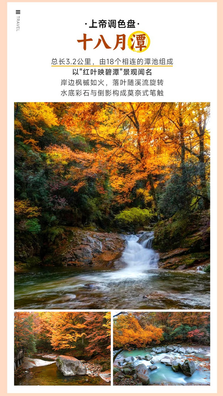 早餐后,我们从汉中出发,沿着蜿蜒的盘山公路深入,抵达被誉为"红叶水韵童话世界"的【十八月潭】(行程距离:130km行车时间:2.5小时)。这条3.2公里长的秘境,由18个翡翠般的潭池串联而成,十月底的红叶如火如荼,金黄的银杏、橙红的枫树与碧绿的潭水交相辉映,落叶随溪流旋转起舞,木栈道上每一步都沙沙作响。乘车至光雾山密林深处,到达素有“月潭赛九寨,红叶天下绝”之美誉的【十八月潭】,长约3.5公里的珍珠沟内密布着18处形似月牙的瀑潭,溪水从布满红叶的山间流过,红叶随溪水漂流不时打着回旋,与漫山彩林勾勒出如画般醉人秋景。思月潭、净月潭、仙女潭、孔雀潭......眼里是盛不完的景,镜头有捉不住的秋。要说ZUI具特色的一潭,莫过于这高约50米的【婚纱瀑布】,远远望去仿佛洁白头纱,纯净无暇。大家可以利用慢门捕捉到这一绝美风光。