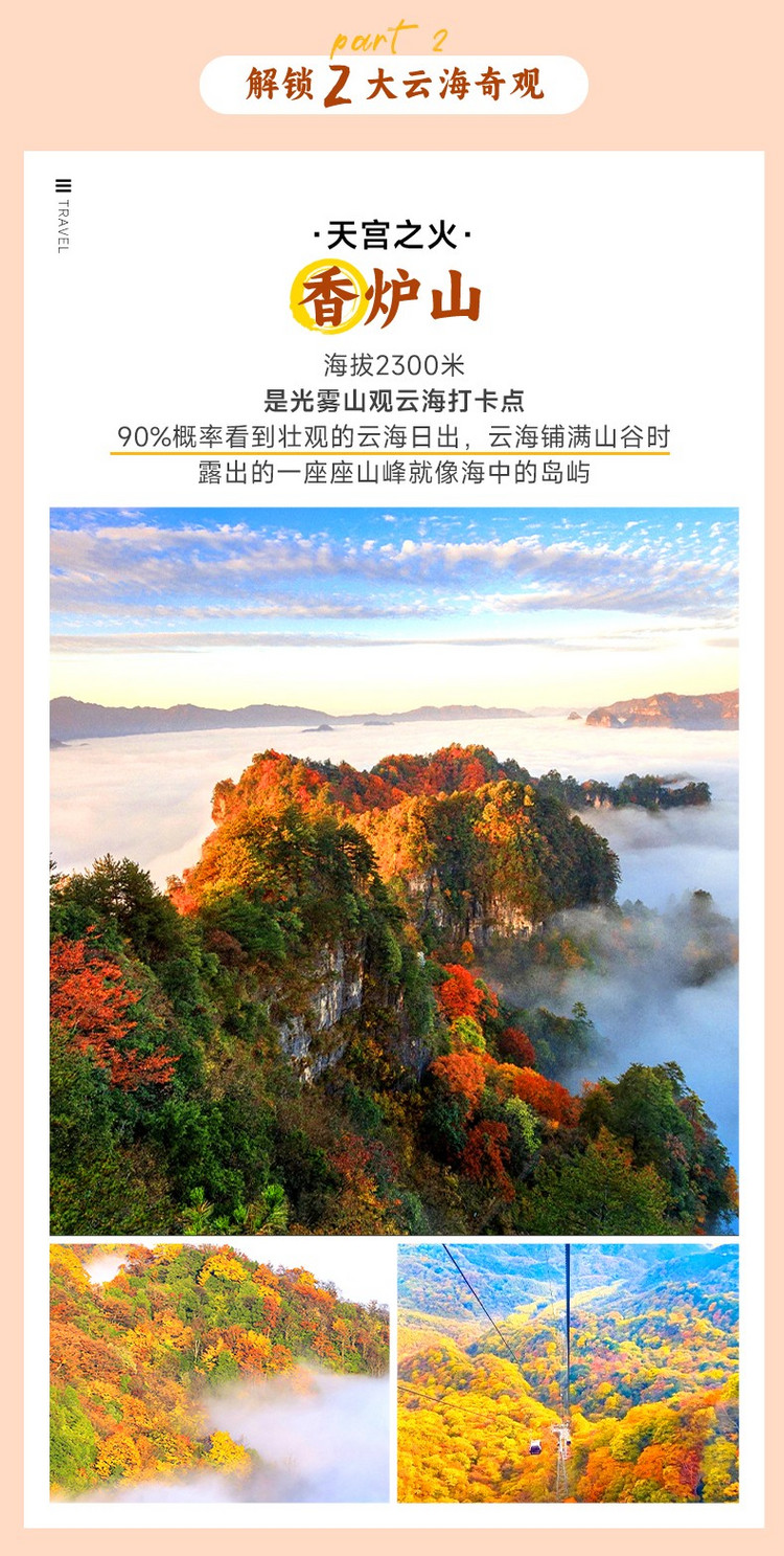午后,先坐透明索道20 分钟直达海拔2330米的【香炉山】山顶。也可选择徒步挑战!抵达后立于山巅观景台,脚下云海奔涌,远处层林尽染,万亩彩林在秋阳下熠熠生辉,场面震撼如仙境,有胆量的朋友可以尝试再走 2300 米的玻璃栈道,惊险又刺激!