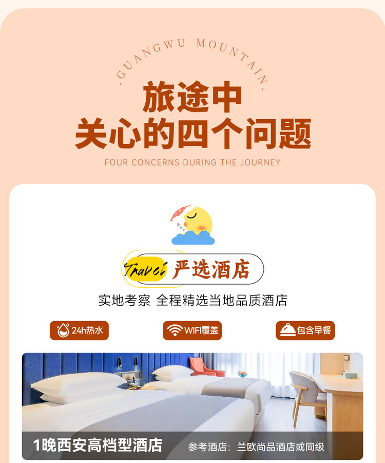 飞机返程需提前3个小时到达机场,西安高铁站到机场全程接近26公里有40分钟车程。火车站离西安高铁站需要40分钟,请大家合理安排出发时间。时间较早可以把行李先寄存在前台之后到附近去逛逛。