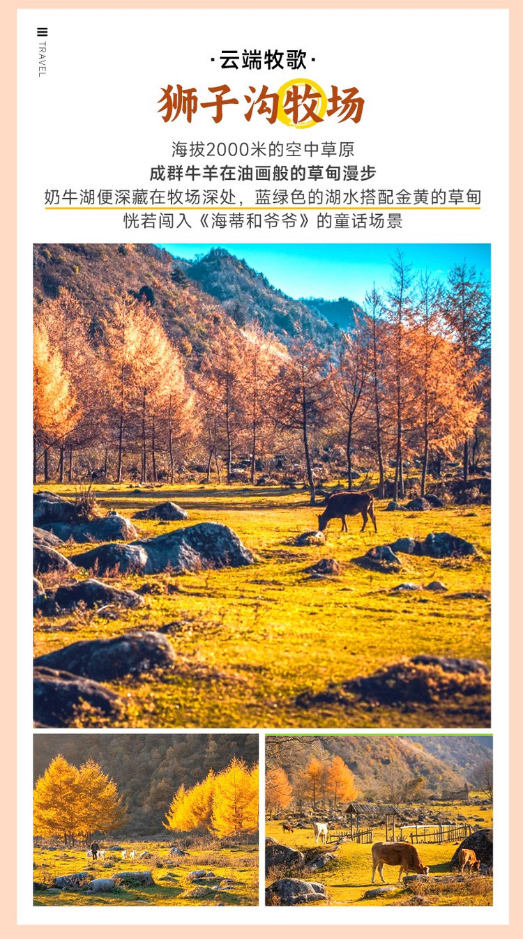 继续前行便抵达海拔2100米的【狮子沟牧场】(行程距离:25km 行车时间:40分钟),金黄草甸上散落着古朴石墙与悠闲的牛羊群,步行15分钟即可到达秘境般的奶牛湖,湖水倒映着雪山与彩林。