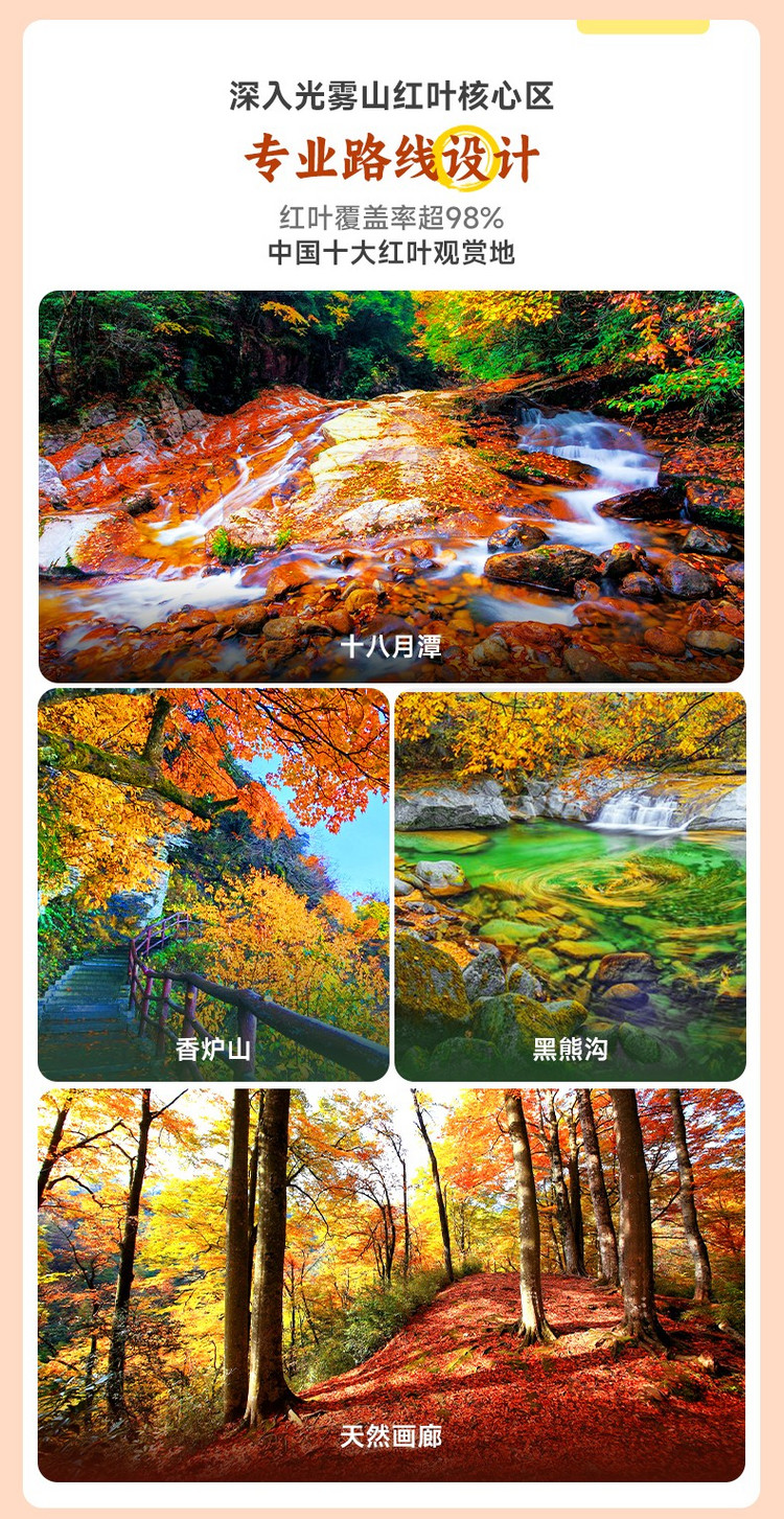 吃完早餐后从光雾山镇出发,今天我们全天畅玩光雾山核心景区米仓山(行程距离:20km 行车时间:30分钟)!抵达景区后,我们的第一站便是【天然画廊】,这里的秋色浓缩而精致。漫步于3公里的原始森林栈道,两侧笔直的水青冈与火红的三角枫构成天然的油画长廊,阳光透过树冠洒下斑驳光影,宛如行走在艺术殿堂!