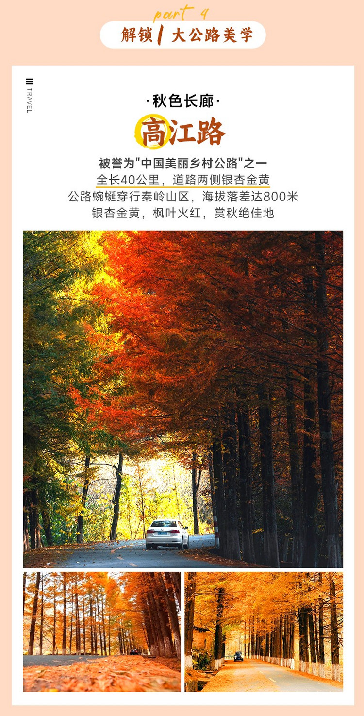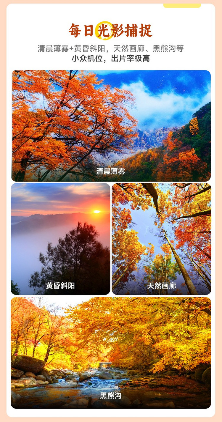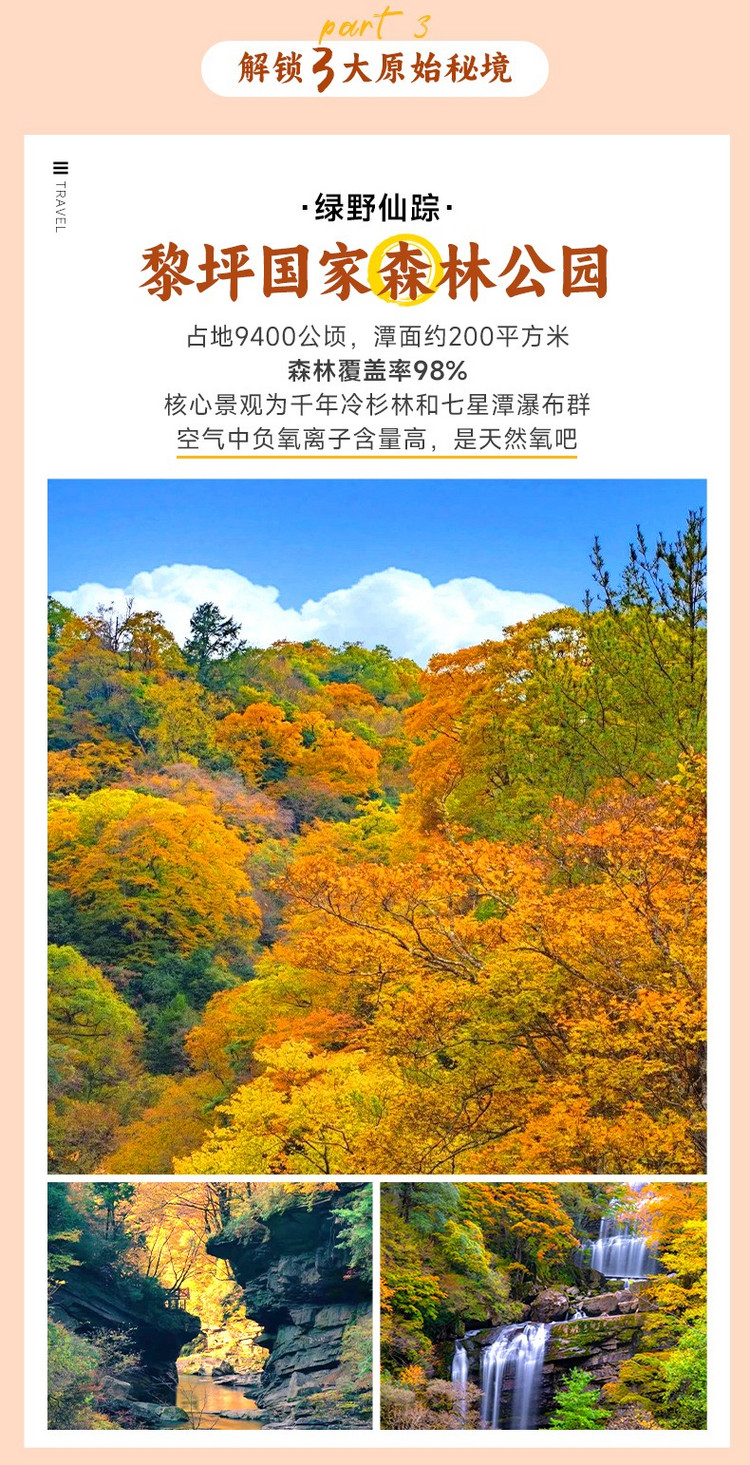 早餐后,我们从汉中出发,穿越晨雾缭绕的秦岭山谷,抵达被誉为"北纬33°绿野仙踪"的【黎平国家森林公园】(行程距离:70km 行车时间:2小时)。这座占地9400公顷的原始森林在秋日化身色彩秘境(游览3小时),漫步在铺满松针的生态步道,30米高的千年冷杉林间洒落斑驳阳光,七星潭瀑布群如银链般串联起七个翡翠色潭池,水声潺潺与鸟鸣相和。一路上,我们与西流河相伴,观赏“一步之隔”的【鹿跳峡】、山崖间玉带般穿梭的【玉女峰】、一道道似龙爪的石岩【中华龙山】、倾泻红叶峡谷间的【枫林瀑布】、宛若海底城堡的喀斯特地貌【海底石城】、传说中七仙女下凡洗浴的浴盆【七星潭】......一步一景,惹人沉醉,是摄影者赏秋、出片的绝佳地。