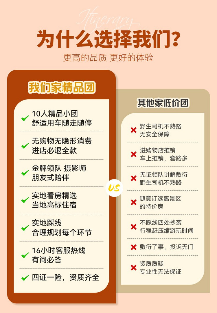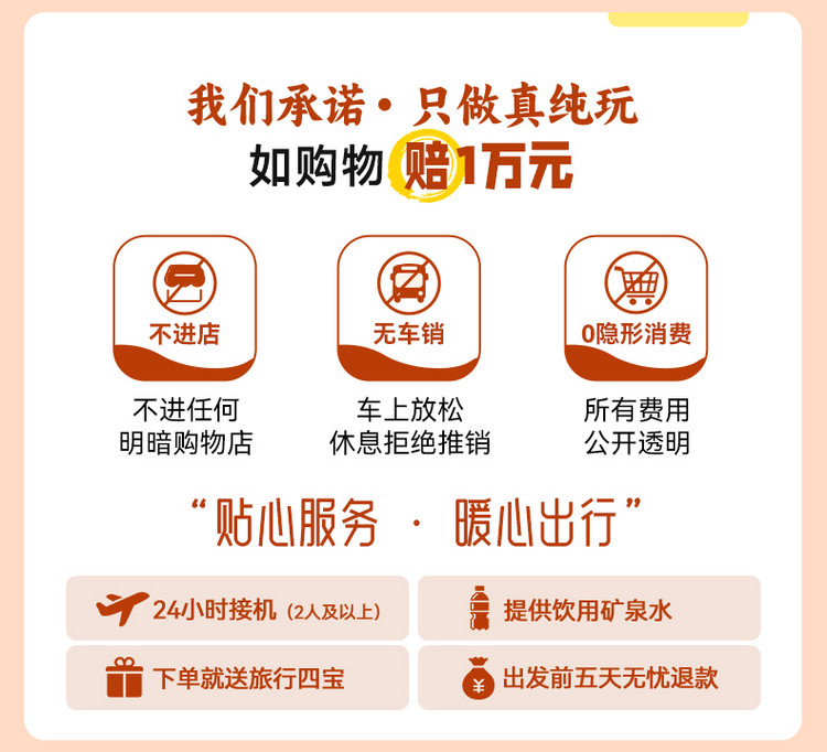 以上行程仅供参考,大家根据自己的航班车次选择返程票。由于旅途中不确定因素较多,领队有权根据实际情况,在不减少浏览景点的情况下对行程进行调整,敬请以出团通知和最终安排为准。