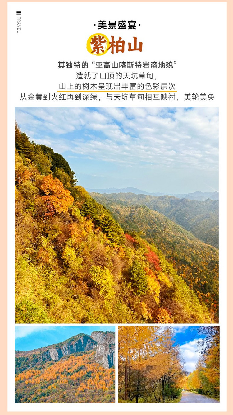 早餐后,我们乘车前往被称为”秦岭小酒窝“【紫柏山森林公园】(行程距离:35km 行车时间:40分钟),当秋意渐渐笼罩大地,紫柏山仿佛被大自然的画笔,染上了绚丽的色彩。每年 10 月上旬至 11 月是紫柏山的最佳赏秋时间。此时,漫山红叶,红黄交织,霞光飞溅,景色美不胜收。高山云雾缭绕,低山彩林如画,乘着彩色的缆车