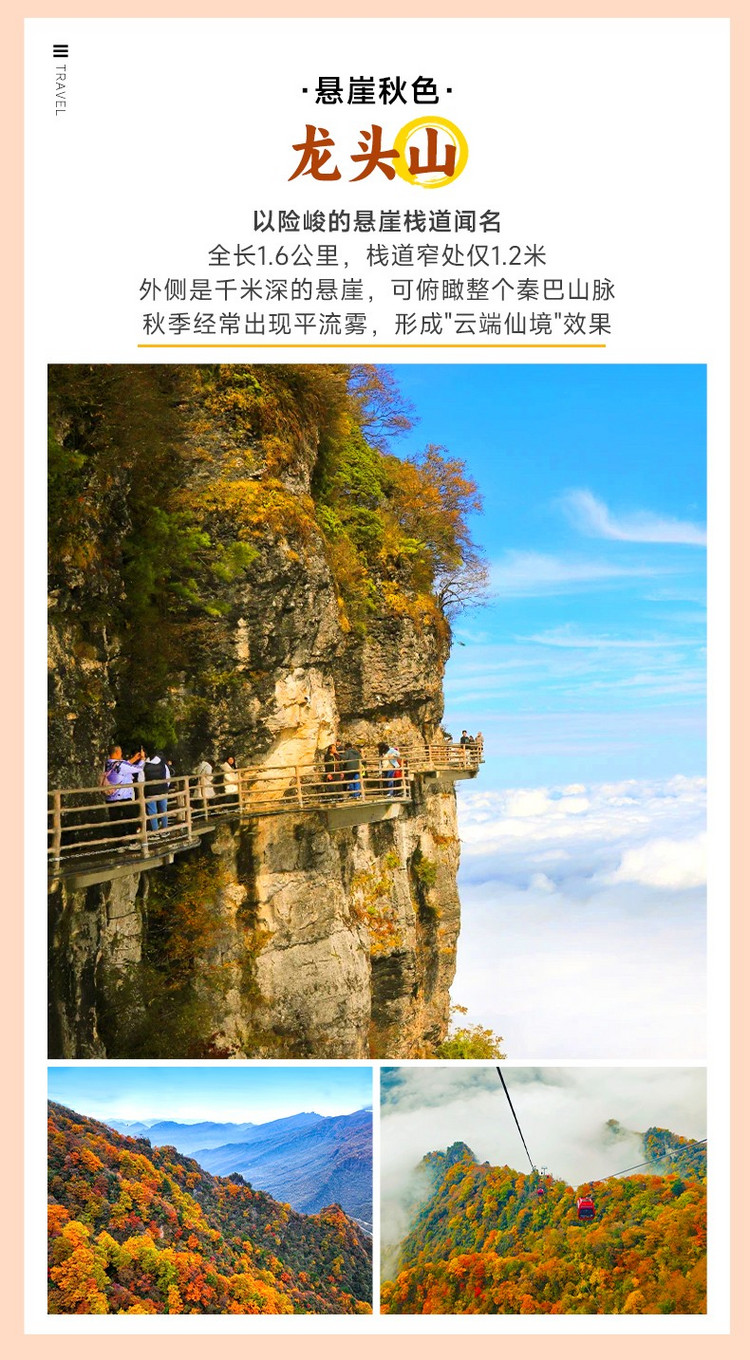 早餐后,我们前往从汉中出发前往【龙头山】(行程距离:70km 行车时间:1小时30分钟),抵达后直接乘坐缆车+扶梯直达海拔2300米的龙头山巅。漫步3.6公里悬崖栈道,脚下是千米深渊蒸腾的云海,身旁是触手可及的彩林,玻璃观景台可拍摄“人在画中游”的震撼大片。