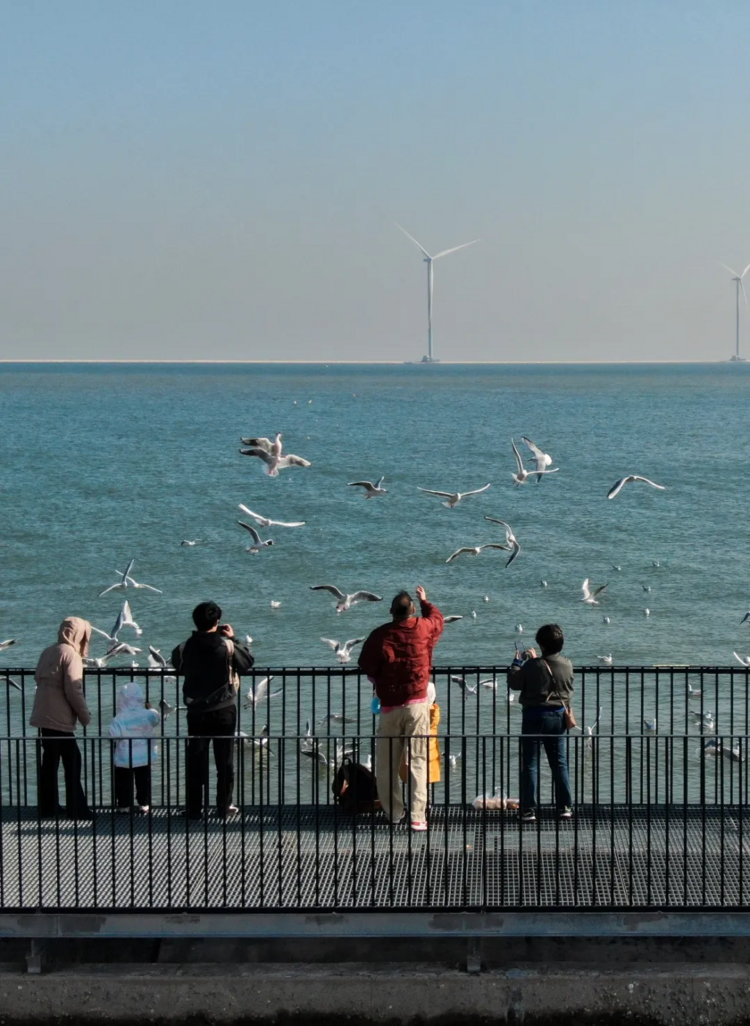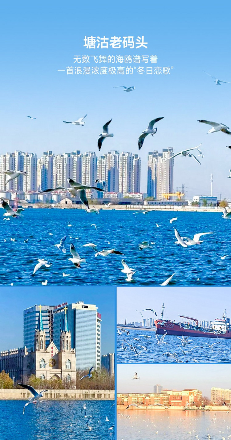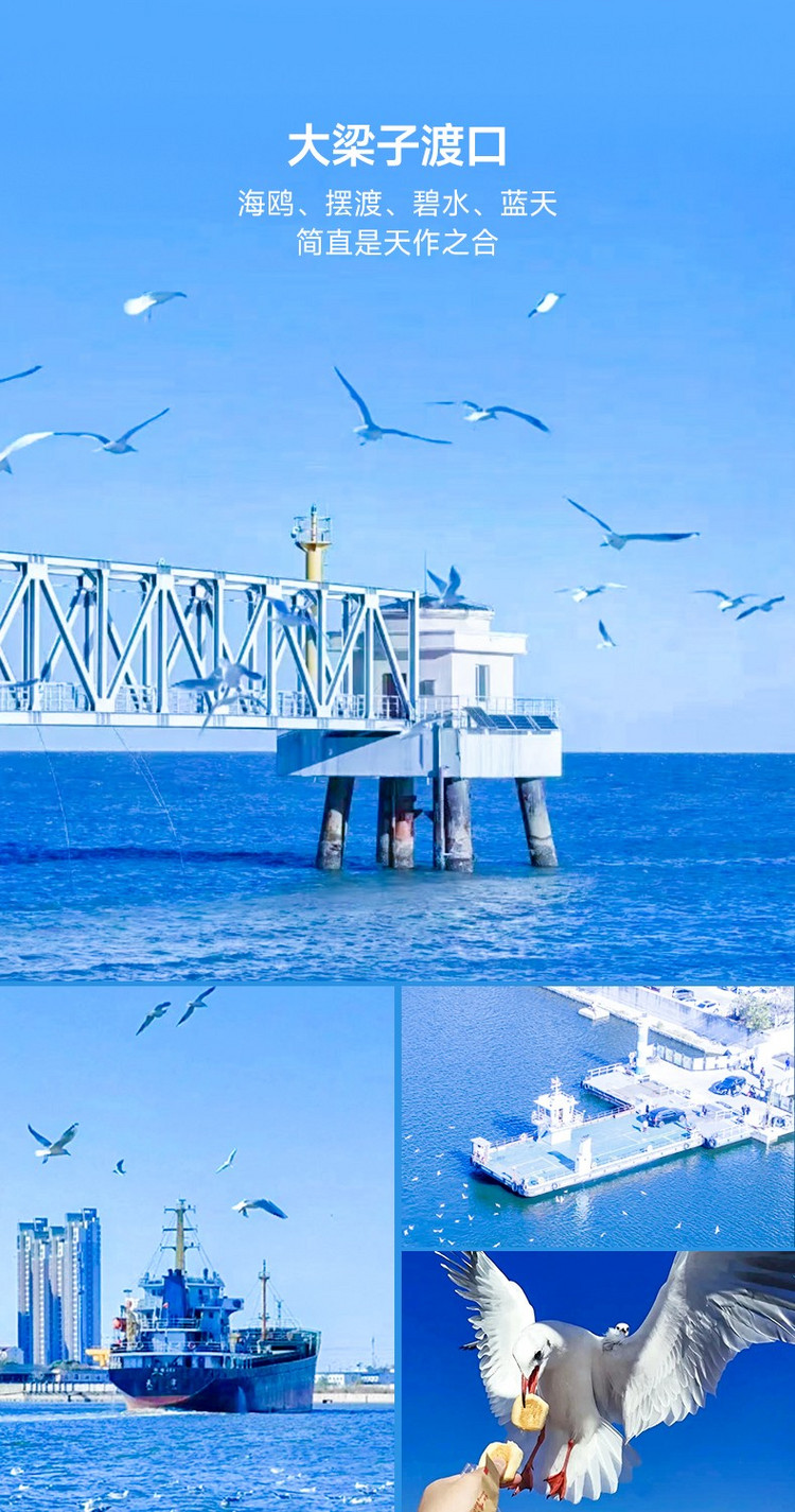12:30 左右前往塘沽老码头,这里是天津现存的码头,可自备面包屑喂海鸥。随后从老码头徒步15分钟左右到达大梁子渡口,可自愿乘坐轮渡,和海鸥合照;