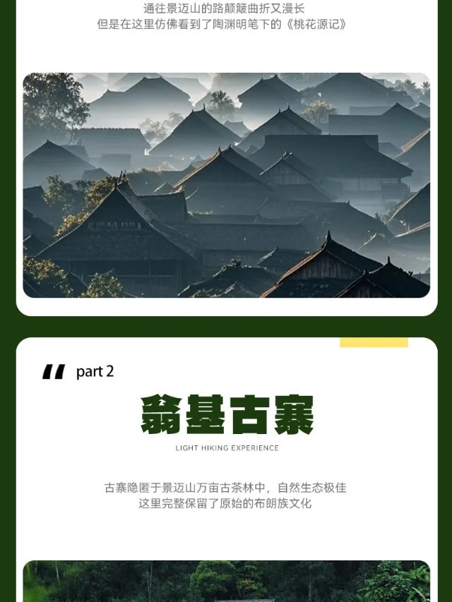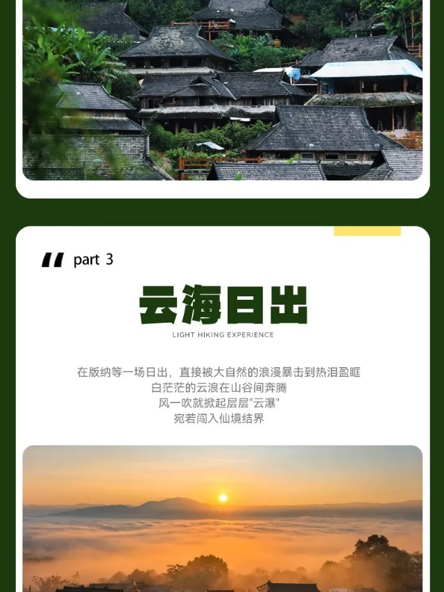 晨光破晓,在翻涌的云海之上迎接第一缕金光,这是景迈山赠与的壮丽序章。 当朝阳为无边的云毯染上金红,我们便踏着晨露,步入万亩古茶林的深处。徒步于苍劲的千年古茶树之间,呼吸着浸润茶香的空气,仿佛每一步都在与历史对话,触摸着这片土地绵延千年的生命脉搏。