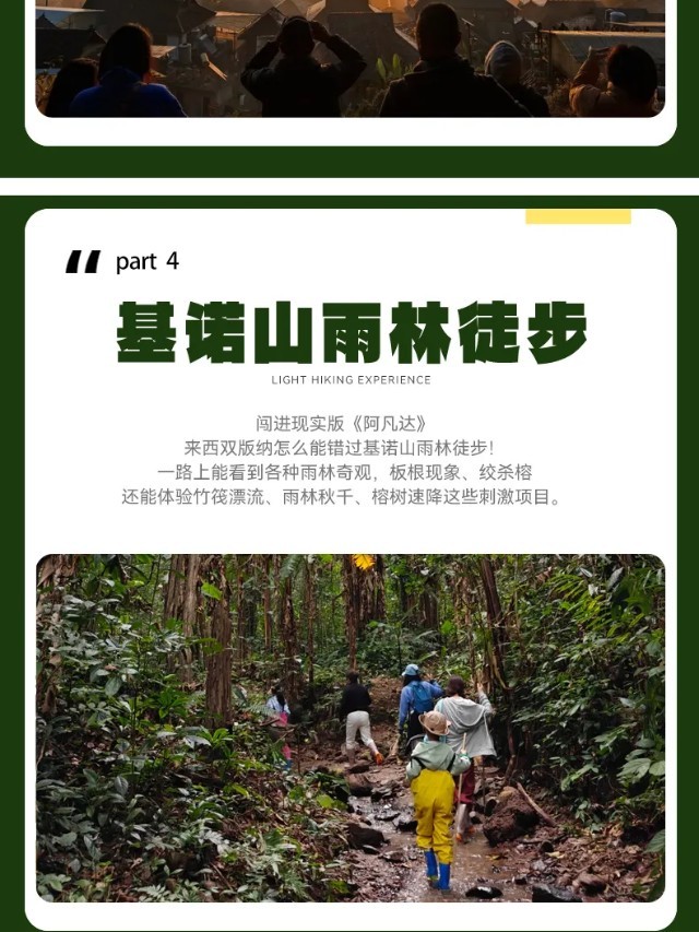午餐我们将在原始森林内,体验一次别具一格的雨林宴(包含)。在热带地区,有一种特别的餐食叫—绿叶宴。沿袭当地丛林先民曾经在丛林用餐的简易且环保的方式,用芭蕉叶等绿色的叶子包裹食物。继续探索雨林,行走在雨林之中,一切都显得无比奇妙,还可以体验【射箭】,【竹筏】,【丛林大秋千】,【探寻丛林生物】(包含)等等丛林体验活动。今天我们就来一探究竟,亲自去体验这一神奇的雨林。跟着向导穿梭于雨林,这里的树木高大茂密一边走辨认路边的奇妙动植物。这是一堂活生生的户外生物课。