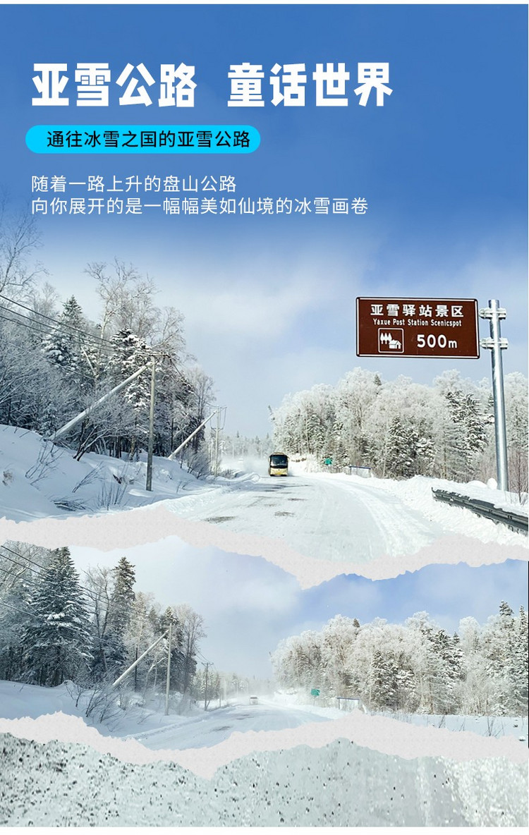 12:00中餐AA或自行解决。途径【亚雪公路】,随着一路上升的盘山公路,向你展开的是一幅幅美如仙境的冰雪画卷。