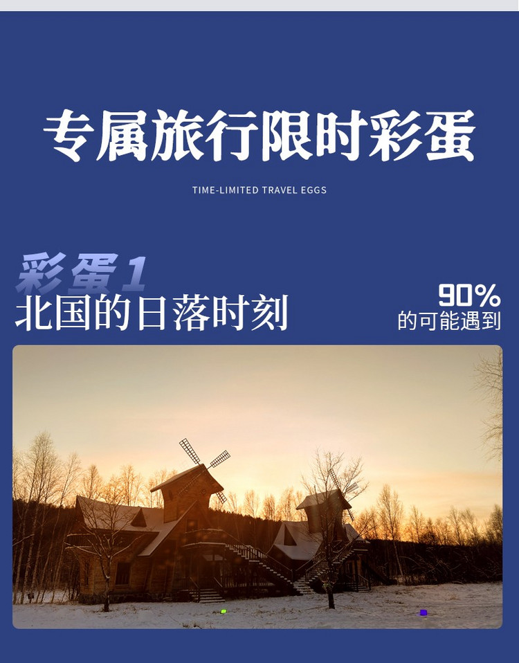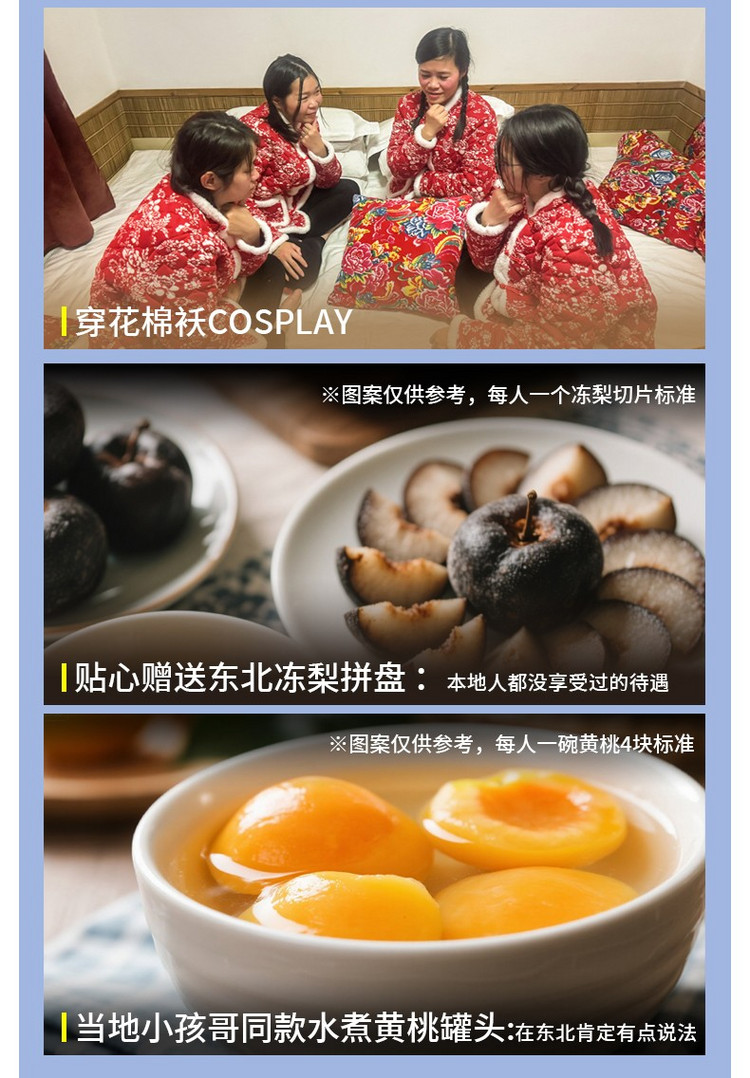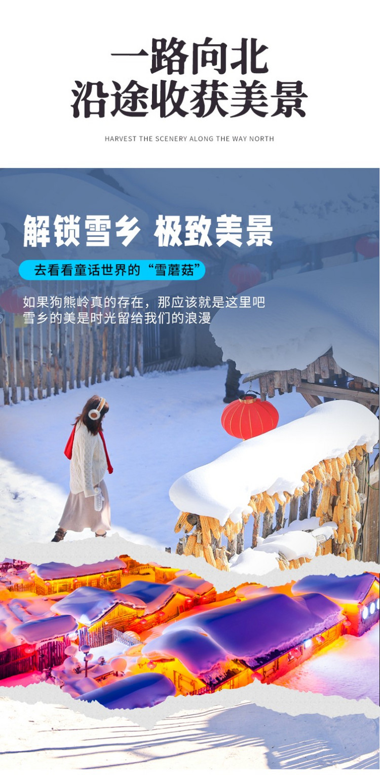 17:00 随后雪乡内自由玩耍,可以走走雪韵大街,欣赏雪房子,寻找雪蘑菇,还可穿上乡村特色的花棉袄COSPLAY。东北冬季日落时间非常早,大约四点多的时候天就已经黑了,可以漫步棒槌山栈道,俯瞰【雪乡夜景】红红的灯笼映在洁白的雪地上。也可参加雪乡景区举办的雪地蹦迪晚会(如遇景区原因或大风等天气原因不举办不退费用)。