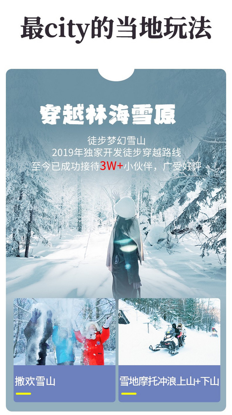 13 : 00抵达前往【梦幻雪山】,我们来到山脚,乘坐【网红雪地摩托】上山;我们在山顶一路上边走边玩,移步换景,大家互相打闹着,玩雪,千万要注意安全哦~适时乘坐雪地摩托下山~