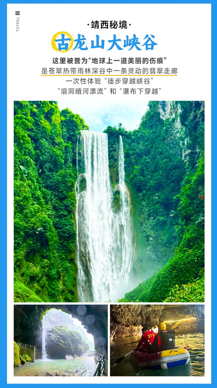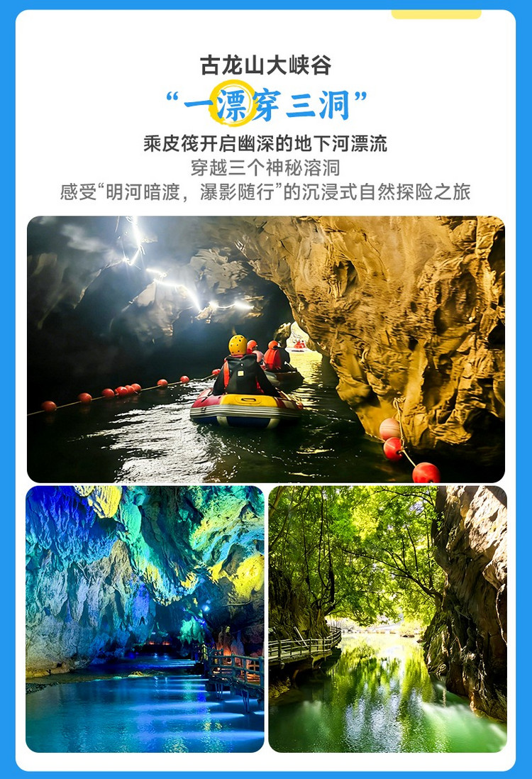 上午的核心是沉浸式探访【古龙山大峡谷】,这里被誉为“中国最具奇幻色彩的暗河漂流地”。我们将换乘橡皮艇,在专业船工的带领下,开启一段“一水穿三峡,一漂穿三洞”的奇妙旅程。船只缓缓驶入幽暗的溶洞,头灯照亮千姿百态的钟乳石世界,耳边只有地下河的潺潺水声与桨橹的回响。漂流终点,还可徒步近距离仰望磅礴的【古龙大瀑布】,感受水雾扑面而来的震撼。