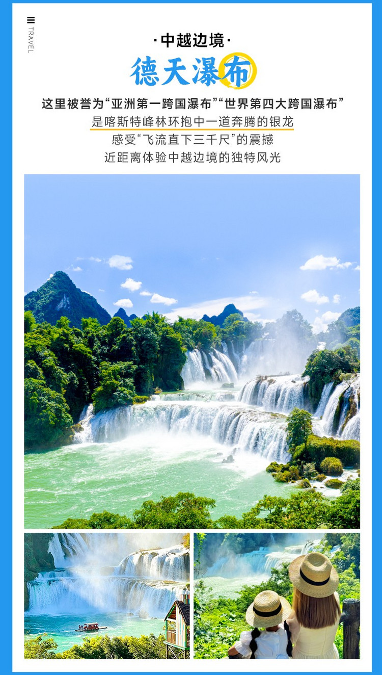 中午抵达被喀斯特峰林环抱的【德天跨国瀑布景区】,乘坐景区接驳车穿行于绿水青山之间,轻松抵达核心观瀑区。稍作休整后,便可开启全景式漫游。首先登上【观瀑栈道】,瀑布的磅礴气韵扑面而来——三级跌落的德天瀑布与越南板约瀑布如同孪生姐妹,携手从翠崖间奔腾而下,归春河上竹筏穿梭,水雾在阳光下折射出七彩虹霓。午后阳光斜照时最是壮丽,飞瀑激起的朦胧水汽将两岸青山染成流动的青绿画卷。接驳车贴心串联各观景点,让你在不同视角与瀑布相遇,全程悠然尽览中越边界的自然奇观。