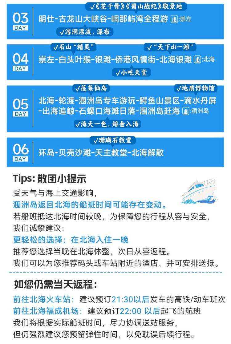受天气与海上交通影响,涠洲岛返回北海的船班时间可能存在变动。若船班抵达北海时间较晚,为保障您的行程从容与安全,我们诚挚建议: