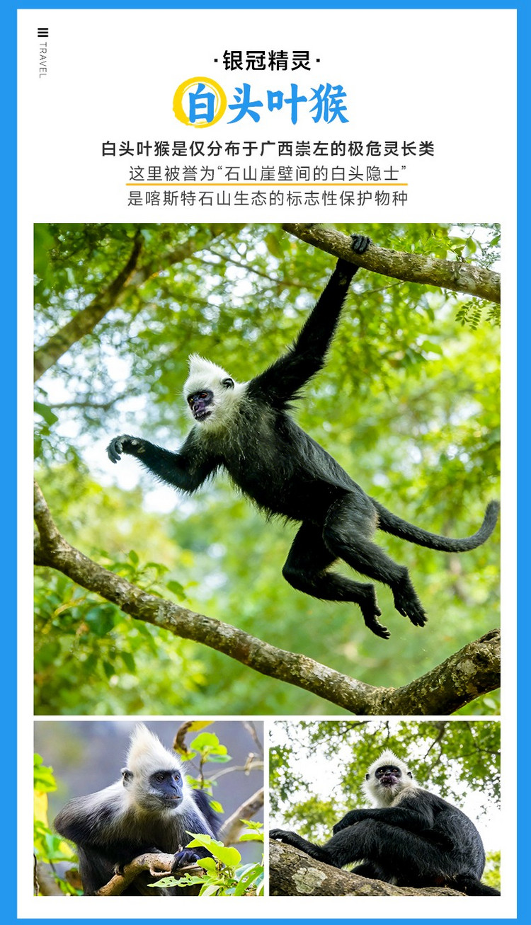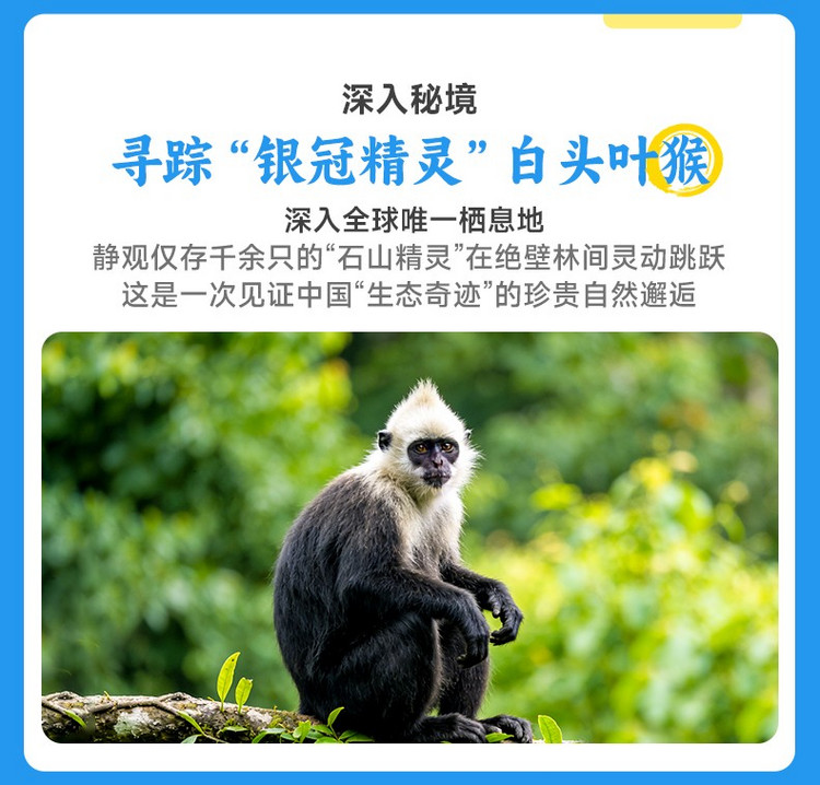 吃完早餐后从崇左出发,我们将前往一个独特的生态秘境——【白头叶猴生态旅游区】。这里是全球仅存约1400只、中国独有的国家一级保护动物白头叶猴的家园。在专业的观猴栈道上,我们将有机会近距离观察到这些“喀斯特精灵”的灵动身影:它们头顶耸立的白色冠毛犹如戴着一顶俏皮的白帽,在金色的悬崖峭壁与绿色山林间飞跃、嬉戏、觅食。最佳观赏时间是上午,此时猴群活跃,带着幼崽的家庭场景温馨感人。请保持安静,用长焦镜头记录下这难得一见的珍稀生物与喀斯特地貌共生的和谐画卷。