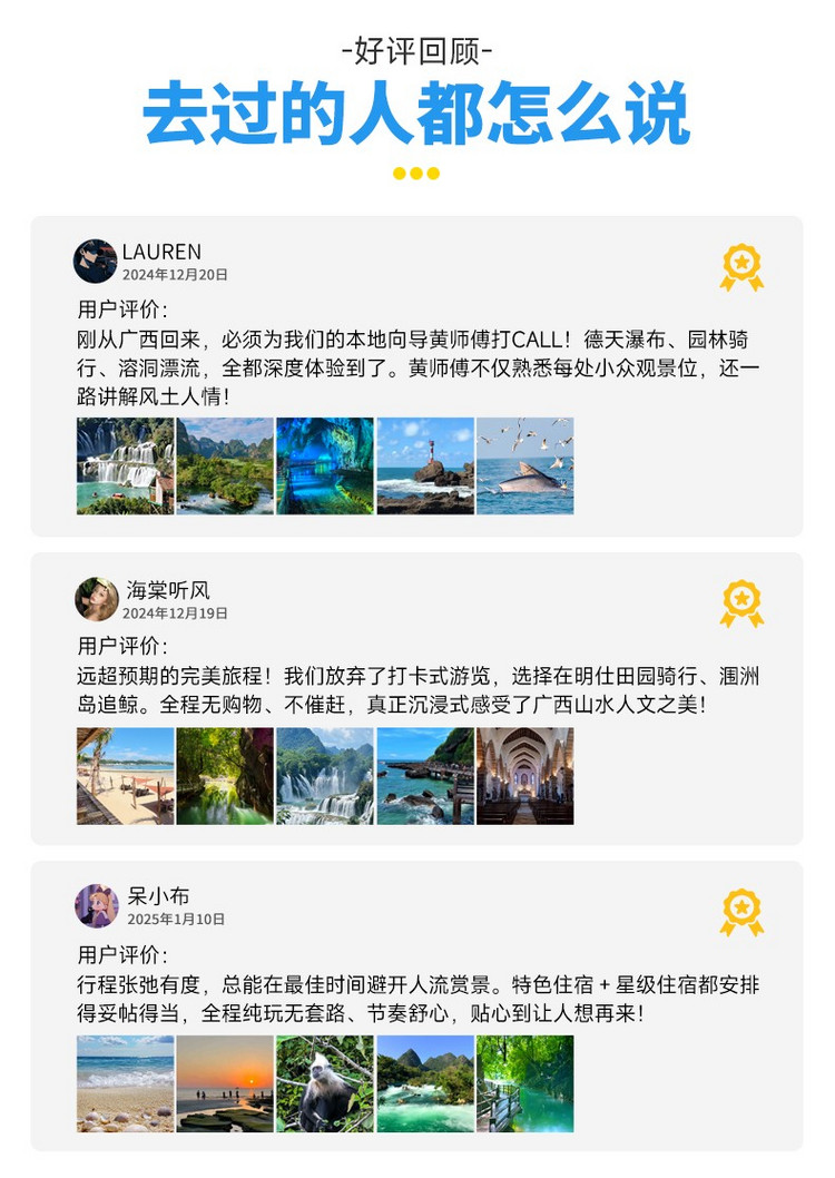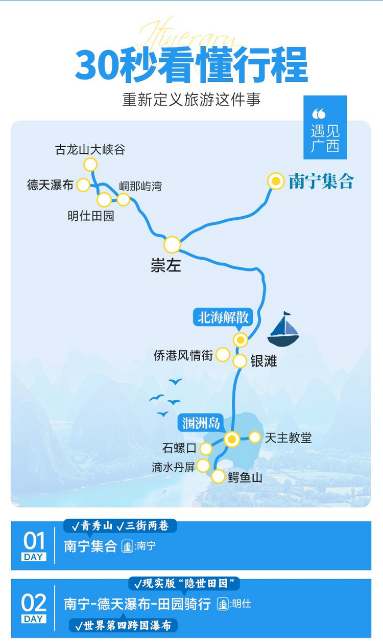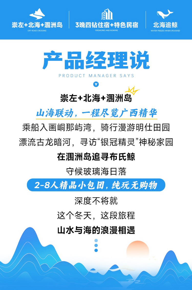 午后,根据轮渡航班时间,专车将送您至码头,搭乘观光轮渡返回北海国际客运港。至此,我们丰富多彩的广西崇左至北海全景之旅便圆满结束。愿这壮美风光,成为您记忆中永恒的珍藏,期待下次旅途再会!