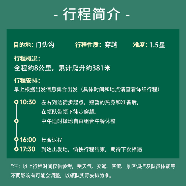 *以上行程时间及顺序供参考,受天气、交通、景区调控及队员体能等不同影响有可能会调整,以领队实际安排为准。