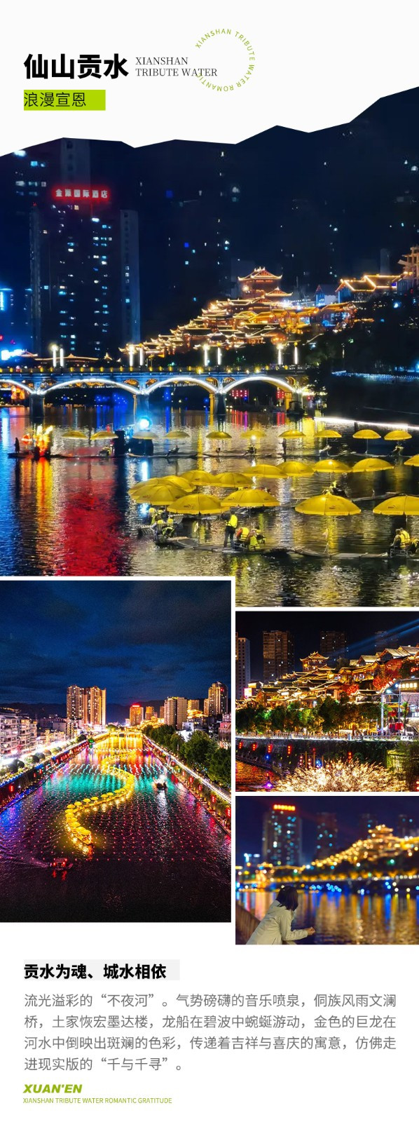 晚上入住宣恩市区酒店。在宣恩这个浪漫小城,一河两岸,灯光璀璨,半城烟火半城仙。国内最长的音乐跑泉在此