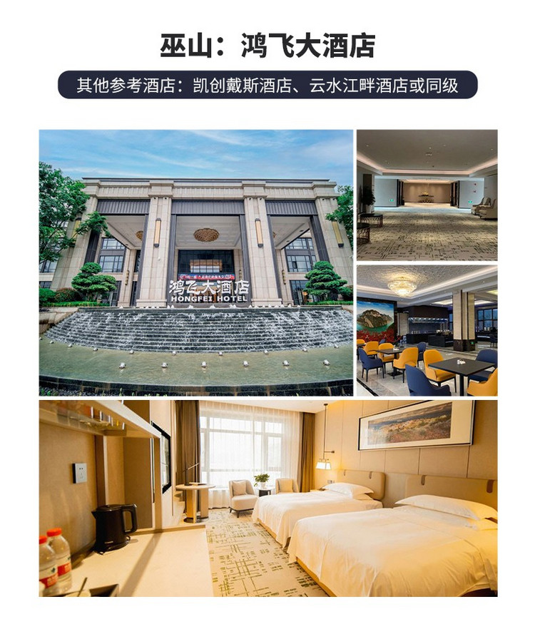 下午驱车前往【巫山】,“曾经沧海难为水,除却巫山不是云。”地处三峡腹心的巫山,自然风光瑰丽无比,历史文化悠久灿烂。作为“渝东门户”,巫山与相邻的奉节、巫溪构成的长江三峡旅游“金三角”,是众多国内外游客游览三峡的首选之地。我们将在巫山长江大桥旁观景台,欣赏巫山山水相依的绝美景观。