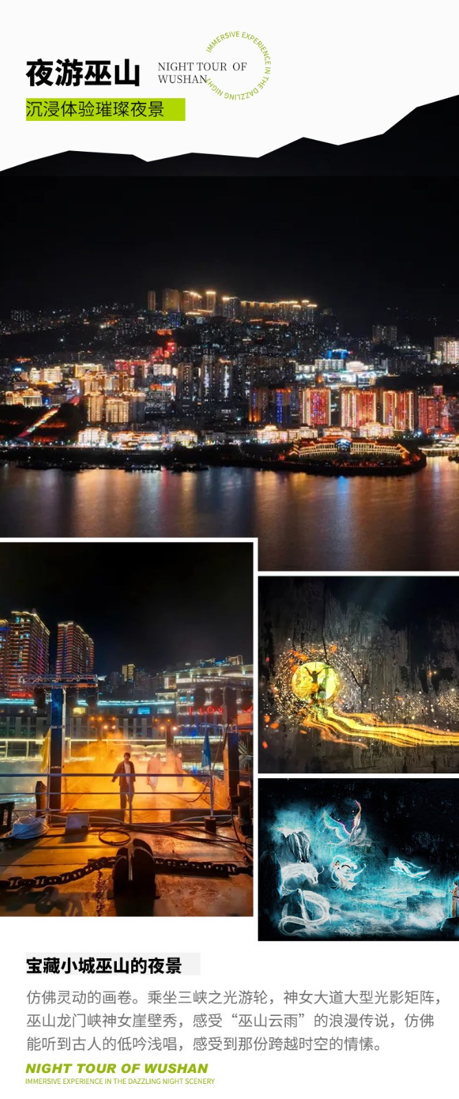 船游过程中包含:非遗民俗文化歌舞互动表演;神女大道大型光影矩阵;南陵春晓诗词演绎;巫山龙门峡神女崖壁秀。