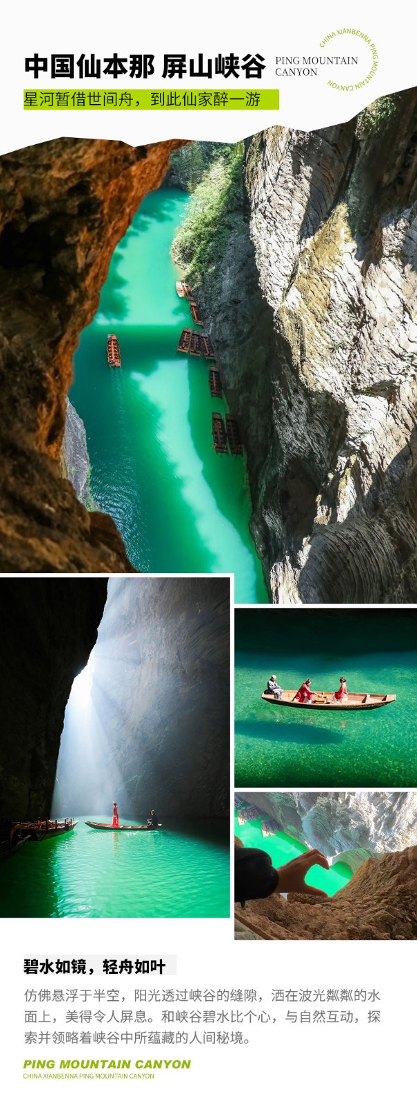 晴日里,阳光折射水面,泛舟其上如凌空悬浮,仙气飘飘;雨天时,谷内温差催生薄雾,云雾缭绕间,宛若闯入缥