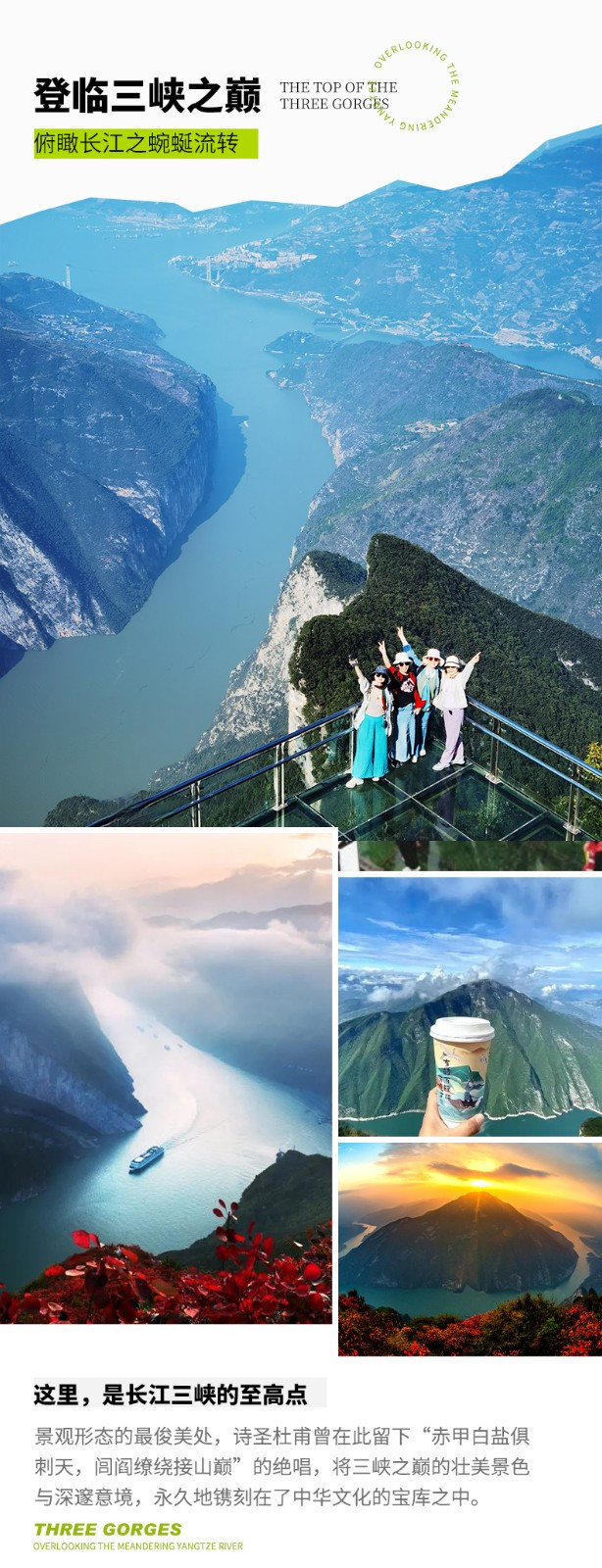 上午前往【三峡之巅】三峡之巅因杜甫“赤甲白盐俱刺天,闾阎缭绕接山巅”的诗句而得名,有夔鼓神坛、四望乐坛、音祖雕像、夔字门、竹律雅欄、迎龙台等景点。这里是三峡的制高点,我们将在这里俯瞰瞿塘峡全景,观长江的壮美,以及群山的拥簇。