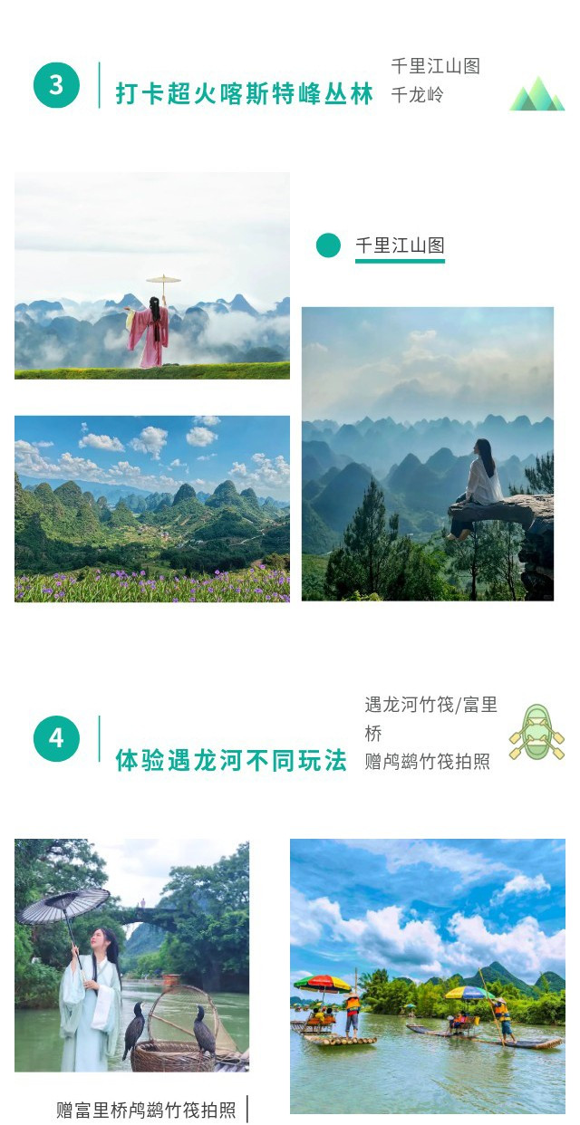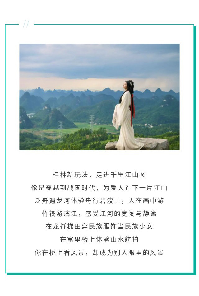 打卡最近火爆全网的千里江山图是众多客人的心头好,一张千里江山图刷爆朋友圈,饱览桂林喀斯特峰林,仿佛穿越到古代的战国时代,为心爱的人许下一片江山。