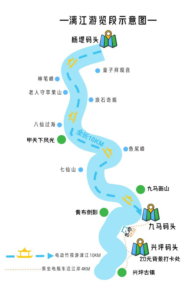 2、16大景观:漓江竹筏杨堤—九马画山段,沿途16大著名景观,包含杨堤烟雨、浪石风光、甲天下、九马画山等著名景观,是公认的漓江精华段;