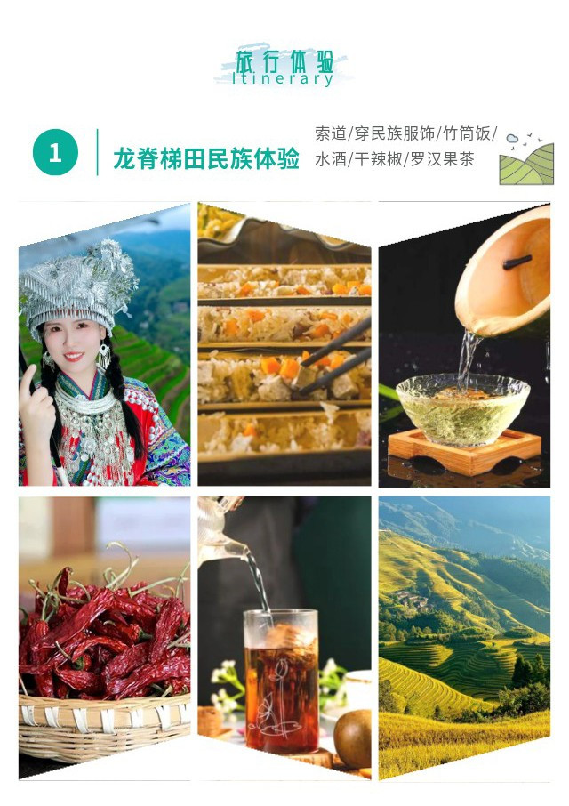 赠少数民族服饰体验(自由拍照)、赠龙脊水酒1人1杯、赠罗汉果茶1团1壶、赠龙脊辣椒1家1袋、升级赠送现烧长筒竹筒饭1人1份(竹筒饭儿童也赠送哦);
