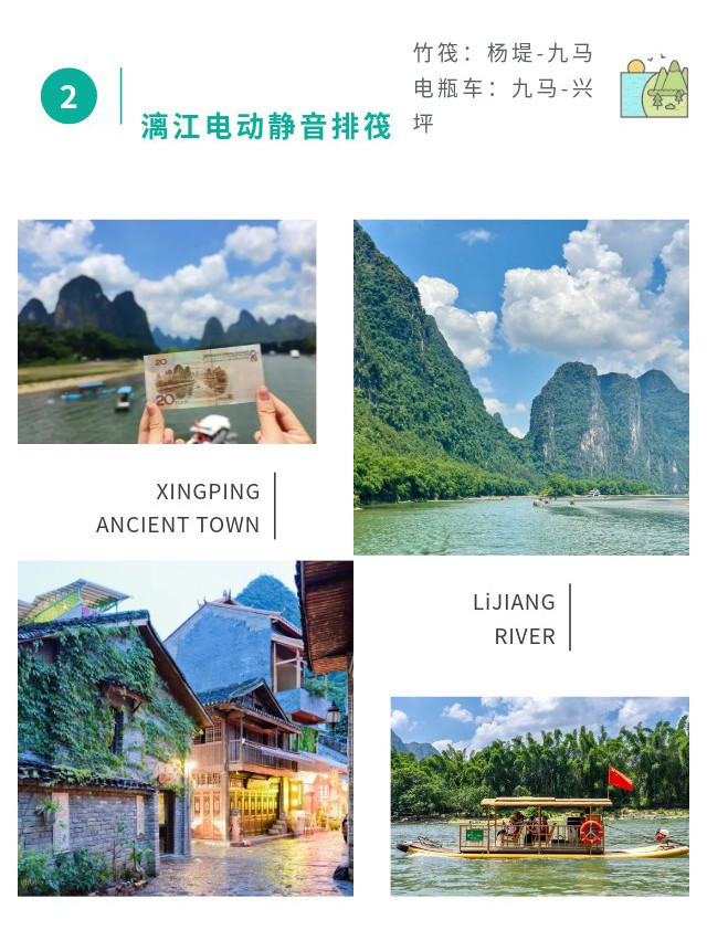 3、兴坪佳境:从九马画山码头乘坐电瓶车前往兴坪,打卡二十元背景处和千年兴坪古镇,陈毅元帅在此留下“果然佳境在兴坪”的佳句。