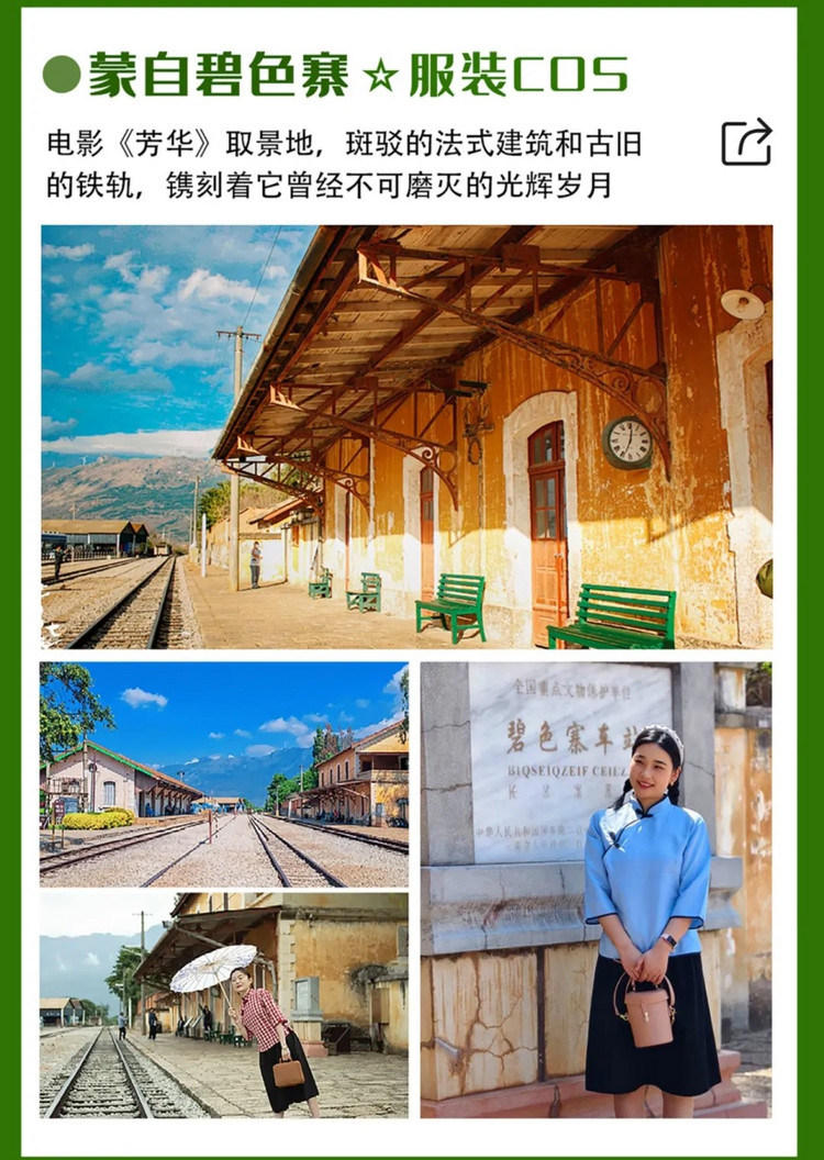 早餐后我们开车前往【蒙自碧色寨】。这里是电影《芳华》和《无问西东》的拍摄地,斑驳的法式建筑和古旧的铁轨,镌刻着它曾经不可磨灭的光辉岁月,现在是摄影师和画家最喜欢去的取景地点(景交电瓶车费30元,自理必消)。在这里我们特地为大家准备了服装,来一次换装体验,大家可以尽情在这里凹造型。