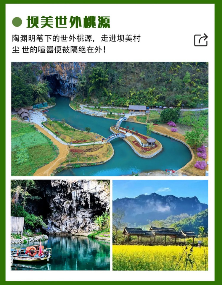 早餐后前往【坝美世外桃源景区】,到达后先乘电瓶车到达入口,然后乘小船穿过约1公里的水洞,当那个与世隔绝的壮族村寨出现在眼前时,你一定会猛然想到陶渊明笔下的世外桃源,‘良田美池桑竹之属’,‘阡陌交通,鸡犬相闻’。因为一切情境与桃花源记竟是如此的相像。到了村子广场,几颗高大粗壮的千年古榕映入眼帘,在这里会预留足够的时间给大家闲逛村寨,了解坝美村的前世今生,听壮族老人给我们讲讲发生在这里的难忘故事。