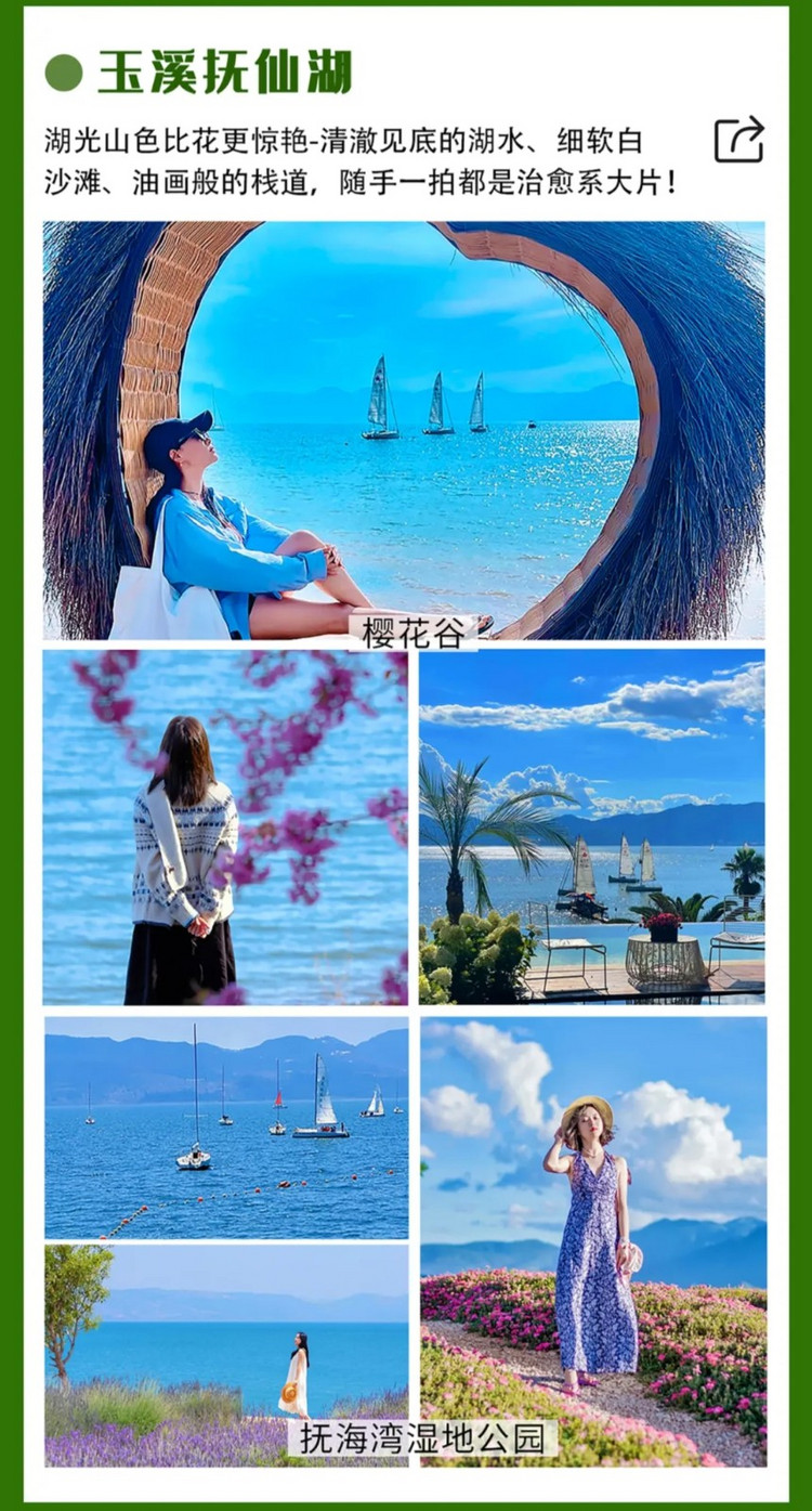 早餐后游玩【西门大板井】,也叫溥博泉,是建水最有名的一口啦,凡到建水的游客都要去大板井打卡,顺便尝尝隔壁的曾记豆腐。结束后适时前往【澄江抚仙湖】,先游玩【樱花谷】,虽然名字带“樱花”,但这里的湖光山色比花更惊艳——清澈见底的湖水、细软白沙滩、油画般的栈道,随手一拍都是治愈系大片!