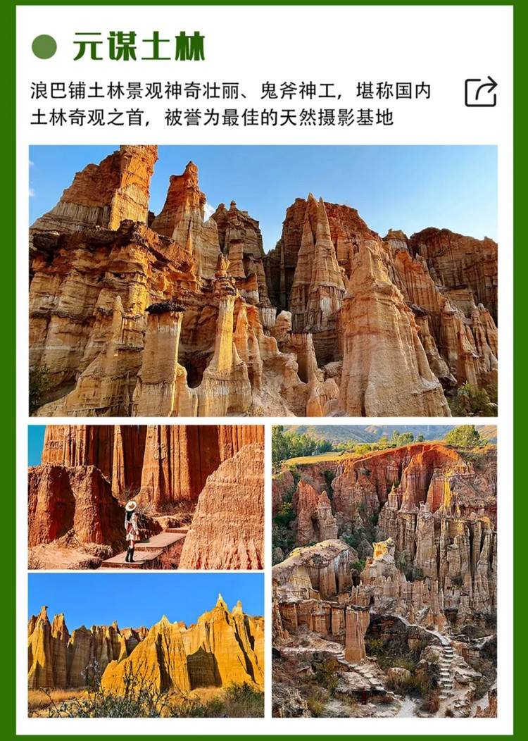 早餐后前往元谋【浪巴铺土林】,这里是不少热播剧的拍摄地。浪巴铺土林景观神奇壮丽、鬼斧神工,堪称国内土林奇观之首,被誉为最佳的天然摄影基地(景交电瓶车费20元,产生需自理)。光线的变化带给土林更艳丽的色彩和更富有层次的形态。如果加之蓝天白云的映衬绝对是人人都能出大片的地方。