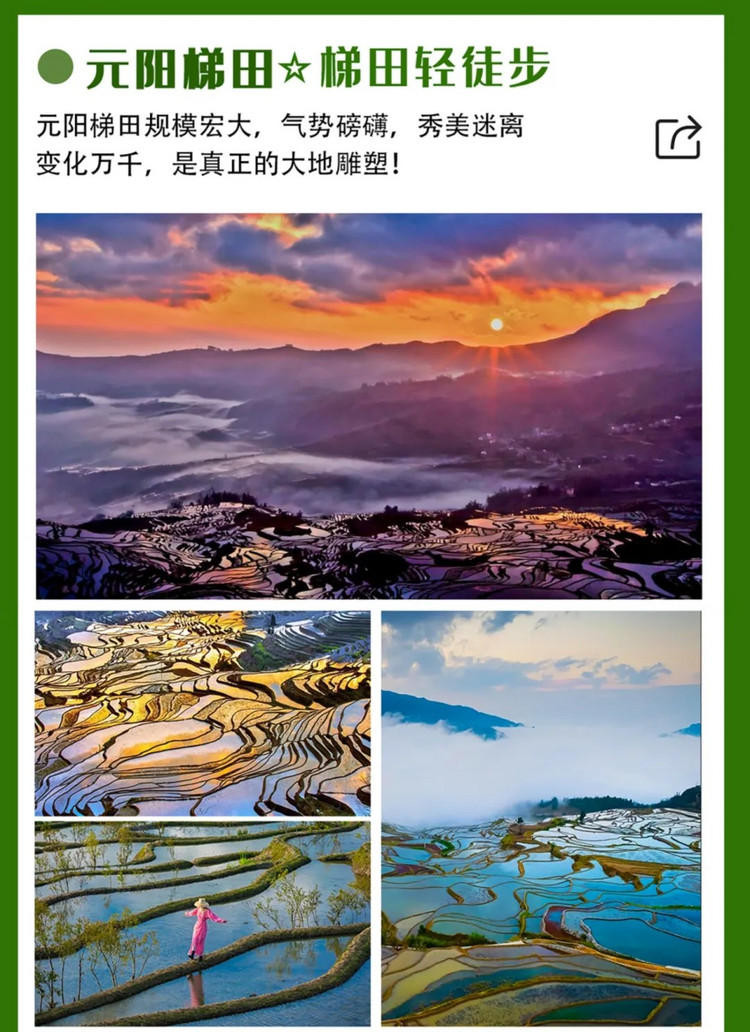 亮点:多依树日出+蓝色梯田+阿者科村蘑菇房+梯田轻徒步+朝阳楼+朱家花园+十七孔古桥,一路风景撑爆您的眼球!