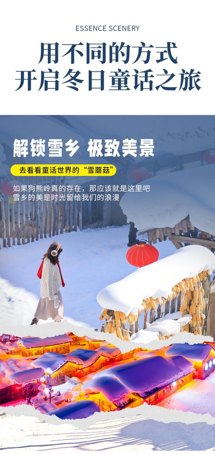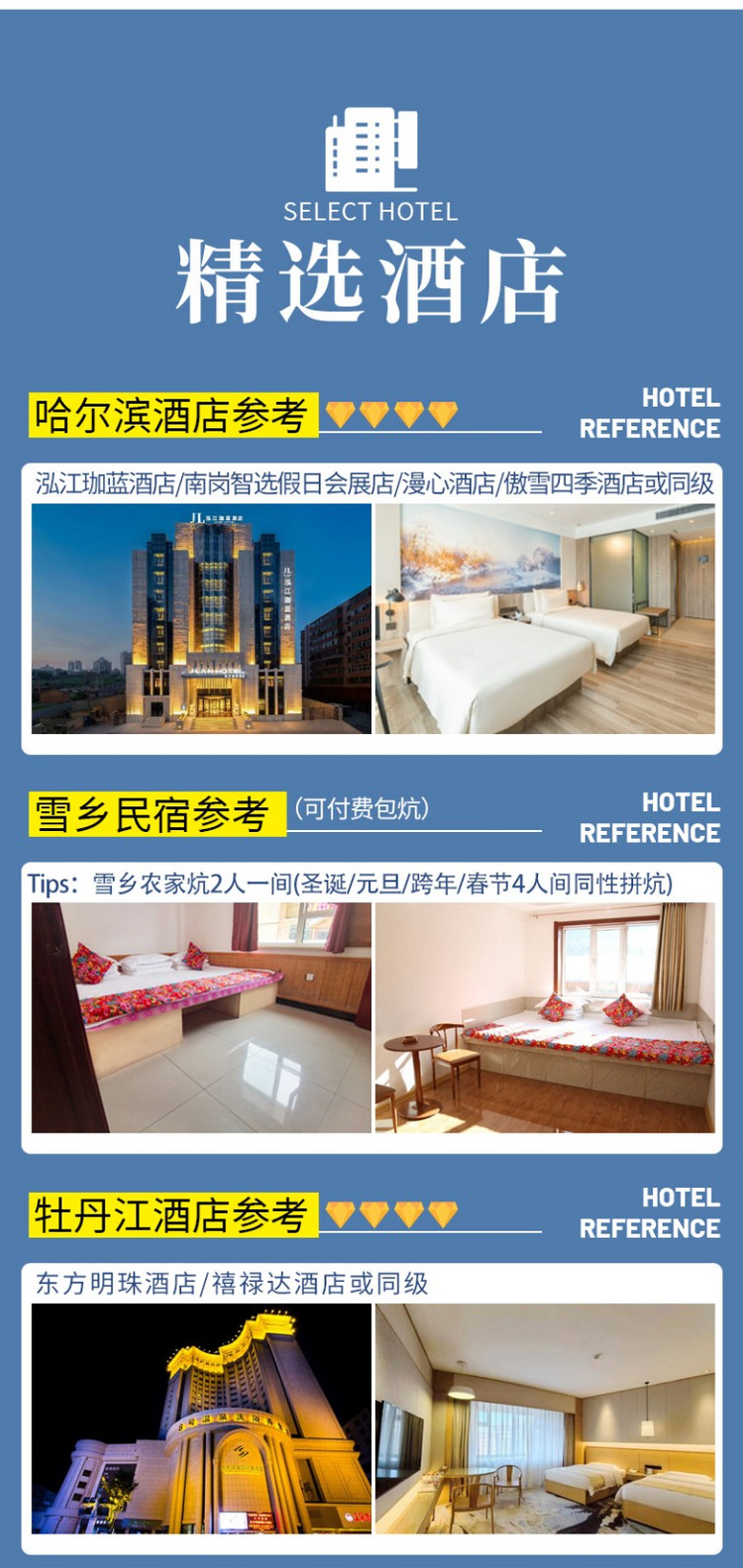 1、雪乡因条件有限不提供一次性洗漱用品和吹风机,请提前自备。