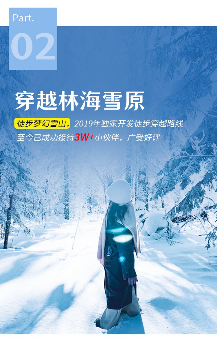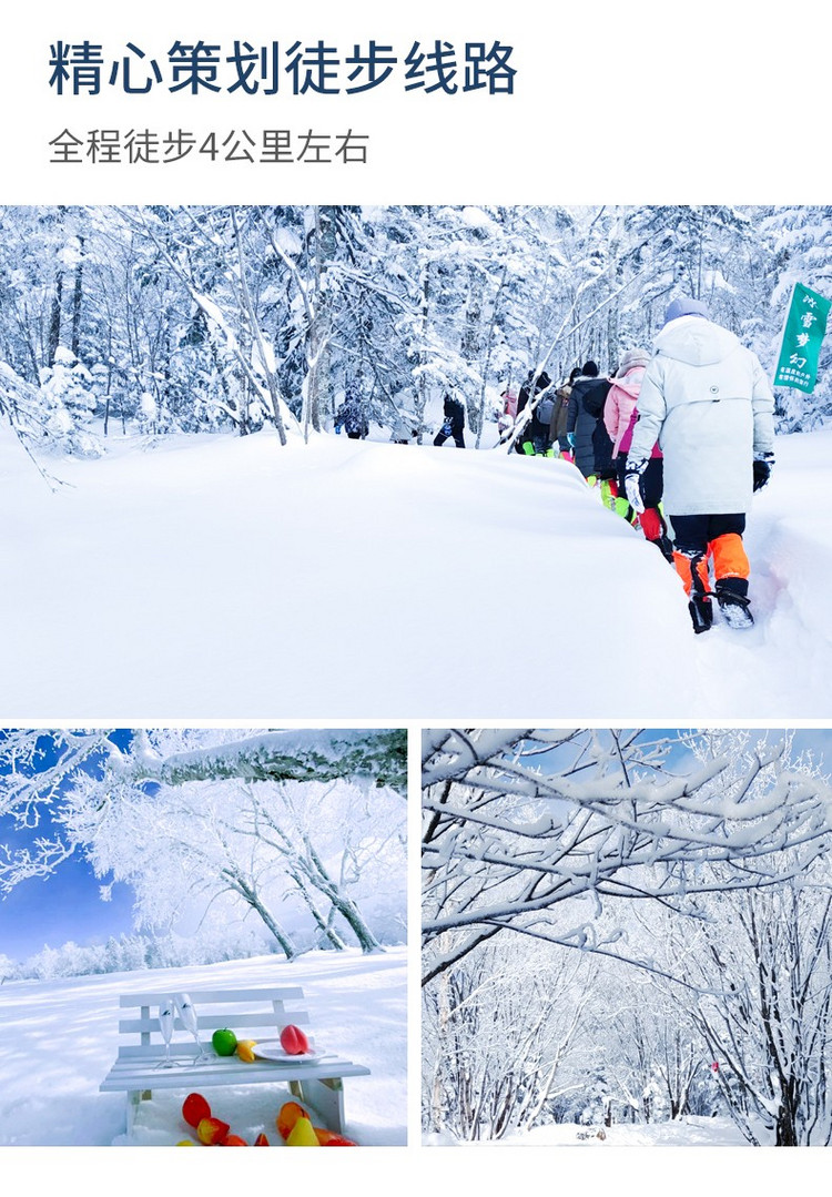 08:30前往【梦幻雪山轻徒步】,我们来到山脚,换上我们的登山雪套后随后跟着领队一步一个脚印上山;上山全程徒步4公里左右,用时约3小时,我们一路上边走边玩,移步换景,大家互相打闹着,玩雪,千万要注意安全哦~