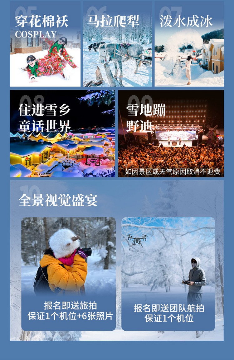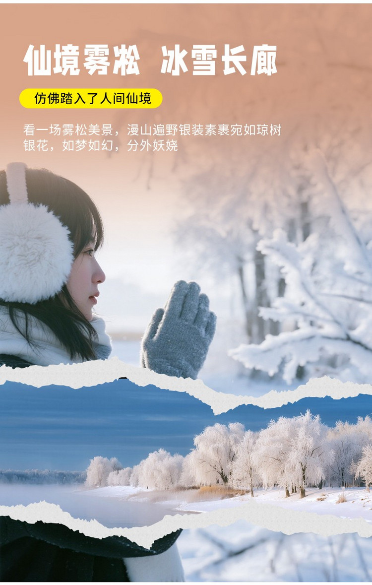 1、雾凇长廊的雾凇属于自然景观,不能保证每日都有,如当日无雾凇则取消此行程,不退费用。