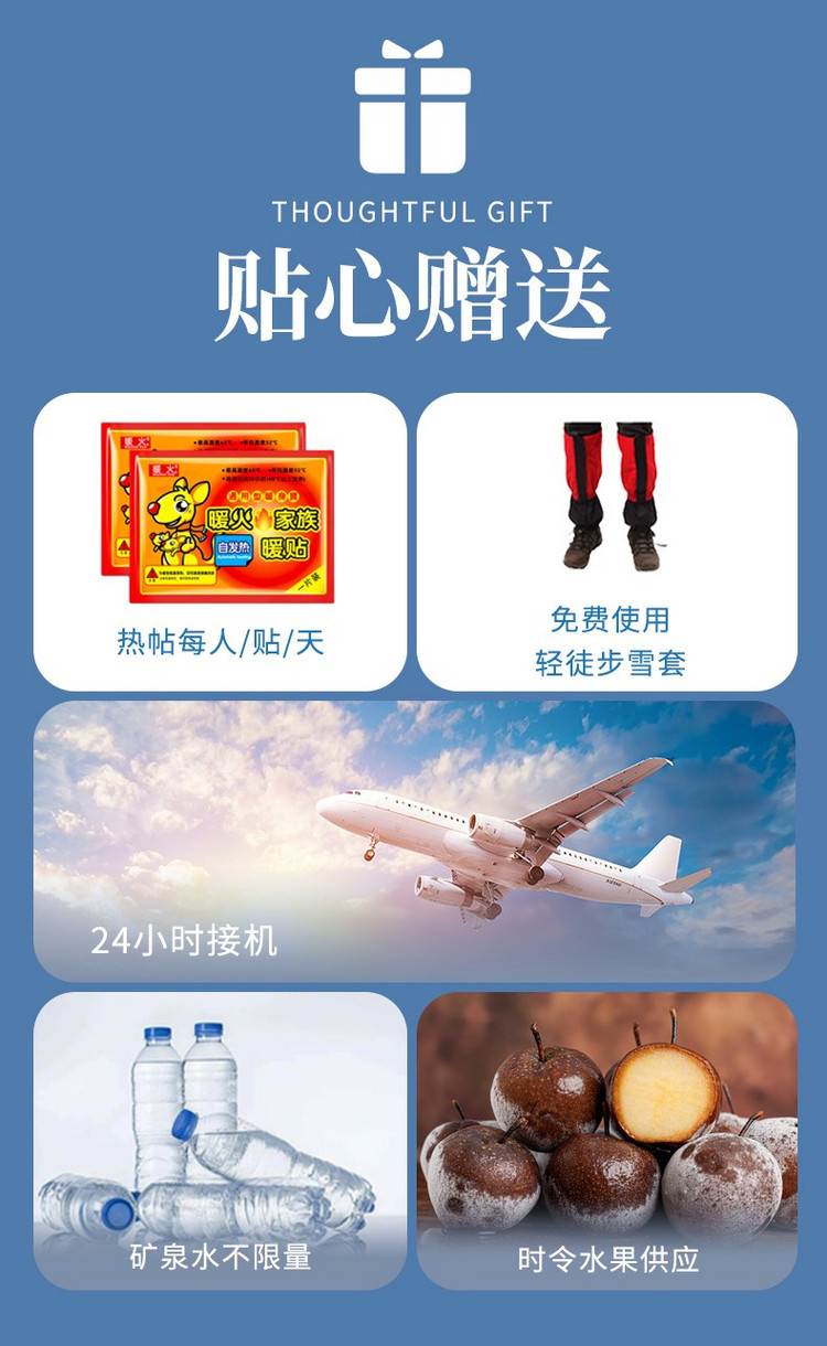 2、如天气原因等不可抗力雪场无法实现滑雪条件则取消,按旅行社优惠价格退滑雪费。