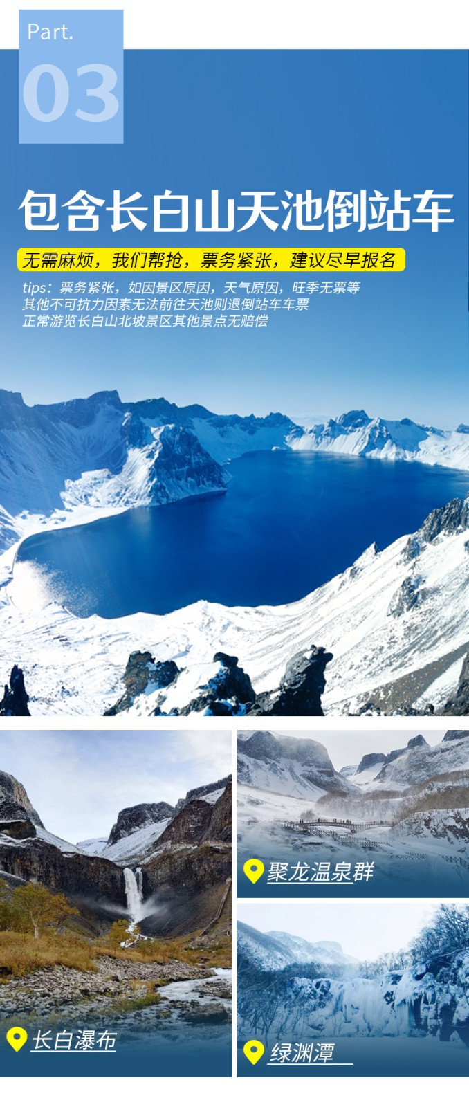 5、长白山由于冬季火爆限流前往,票务紧张,建议尽早报名好提前帮抢长白山天池倒站车票;如因景区原因、天气原因、旺季无票或者其他不可抗力因素无法前往则取消赠送,无退费无赔偿