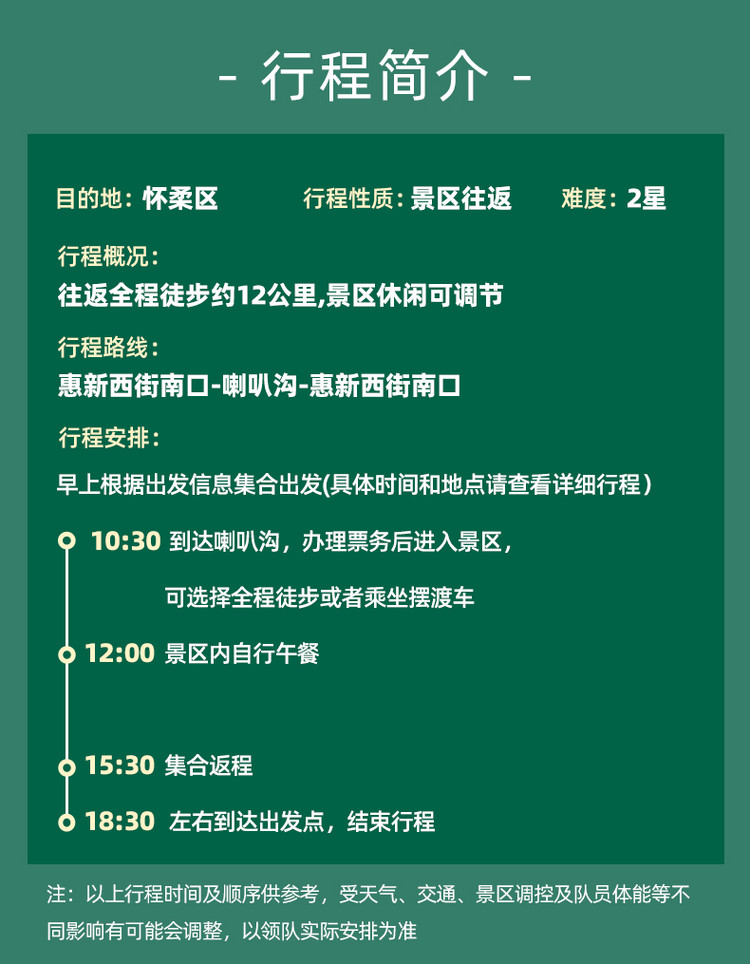 07:30 地铁5号线/10号线惠新西街南口集合准时出发(车程约3小时),路程较远,切勿迟到!