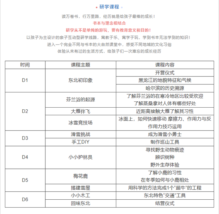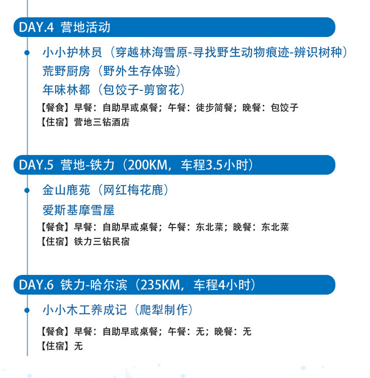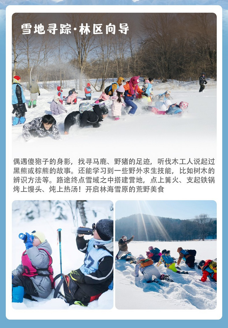 08: 30在向导的带领下,我们徒步林海雪原, 途中向导会为大家讲解山林知识、了解野生动物足迹等,途经安排荒野厨房:目标完成野外生存体验。