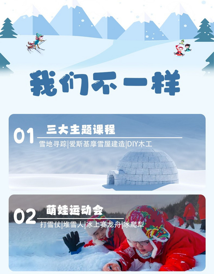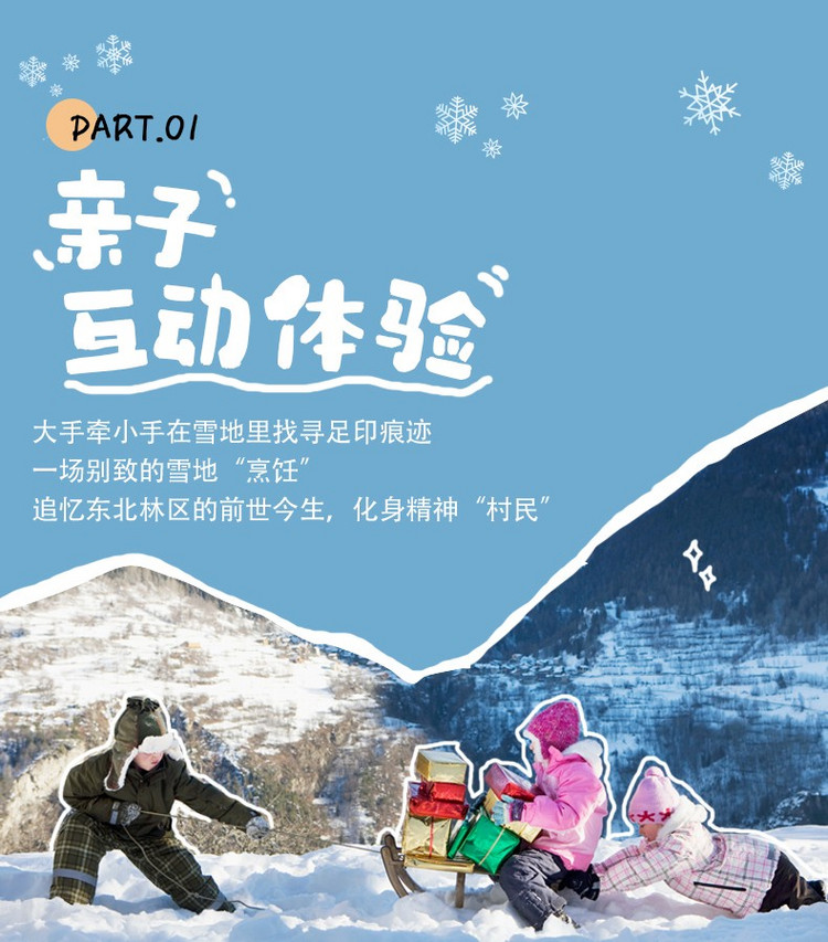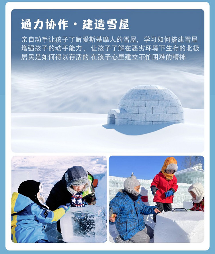 14: 00体验【制作爱斯基摩雪屋】,发挥创造力与想象力,冰上能做的事情有很多!一片雪花如此柔软,一块雪砖却坚硬无比,那一整间雪屋呢?亲自造雪屋,在皑皑一片中寻觅独属亲子家庭的小天地。