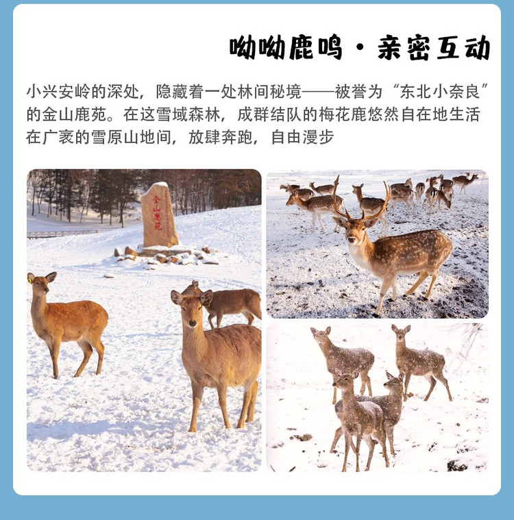 08 : 30抵达【金山鹿苑】,一家半牧式天然养鹿场。梅花鹿如同童话世界里的精灵,奔跑在大雪覆盖的山谷间,为冬季增添了一抹独特的生机。