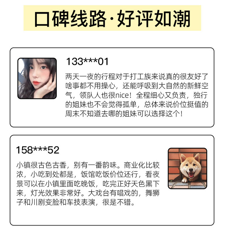 12:30 进入古镇景区自由活动,开启属于您的古镇春游。【古北水镇】(游玩时间约1天),集观光旅游,休闲度假,商务会展,创意文化等旅游业态为一体得长城脚下北方度假小镇,被评为首届北京网红人文景观类打卡地。漫步在小镇的石阶小巷,染一身春色,徜徉在繁花似锦的小镇,寻找内心的安宁。还有年画坊、剪纸灯笼、皮影戏馆、染布坊、烧酒坊、酱菜等,完全是京郊周末出游的首选!