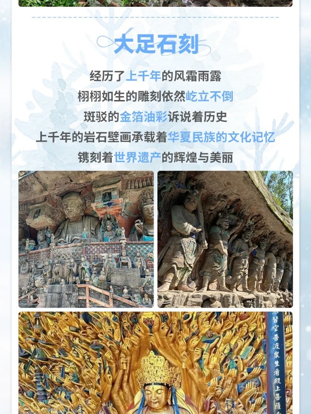 接着游览【大足石刻】(游览时间约120分钟)。大足石刻包括宝顶山、北山、南山等处,在这里可欣赏到保存较好的唐、宋时期的石刻造像艺术,是世界文化遗产。在众多的石刻群中,宝顶山与北山的石刻较为有名,宝顶山的“六道轮回图”和“十恶罪报图"值得细细品味;北山的佛像,既有唐代雕刻的古朴,又具宋代造像的修秀丽。宝顶山石刻是石刻造像的代表作,没有讲解的大足石刻是没有灵魂的,专属升级专业讲解员,宝顶山石刻全程深度讲解,涨知识的石刻不容错过。