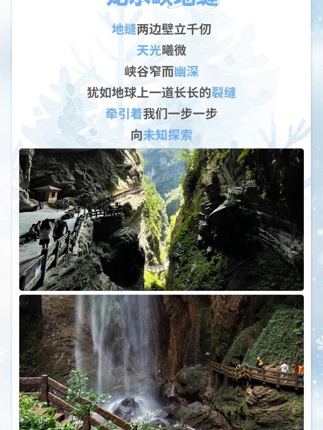 9:00酒店早餐后我们前往【龙水峡地缝】,欣赏瀑布水帘,地缝中老树藤萝盘绕,泉水流瀑挂壁险峻幽深,怪石峥嵘。中午我们在仙女镇用过午餐后返回市区。游览【李子坝轻轨穿楼】。轻轨穿楼随手-拍点击量过万,多少江湖儿女为了几个粉丝不远干里来打卡必到之地。游览结束后前往【长江索道】(游览时间约60分钟),长江索道已经成为了游客在重庆的必游之地。索道起于渝中区长安寺(新华路),横跨长江至南岸区的上新街(龙门浩)。乘上索道,滑向江对岸, 一路可见近在咫尺的钢筋森林、长江以及江北南岸区的风光。游览结束后,是晚餐时间,我们会向您推荐特色美食。