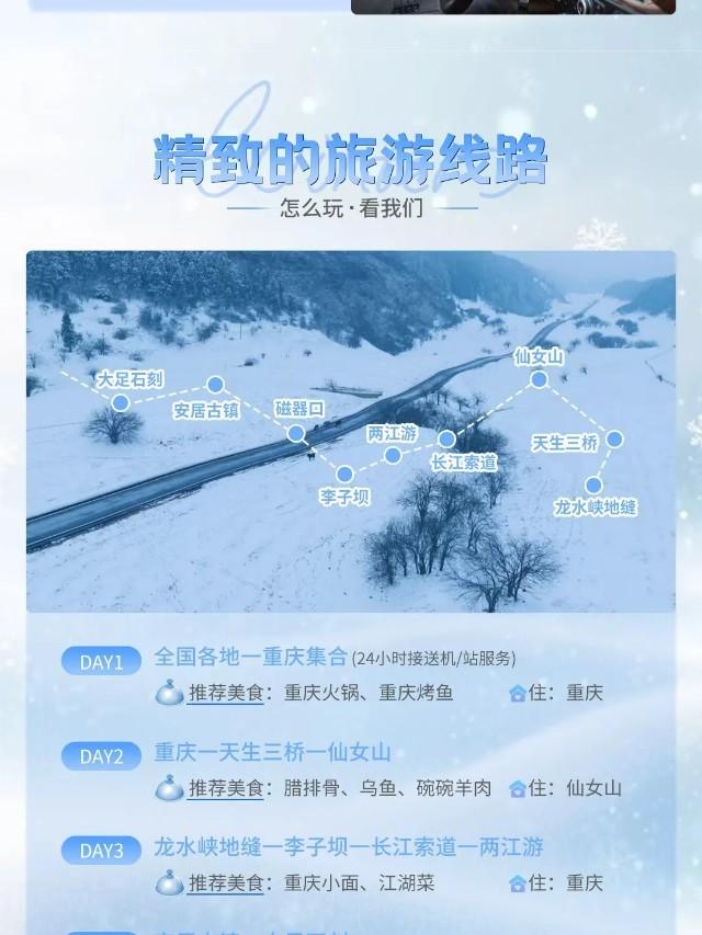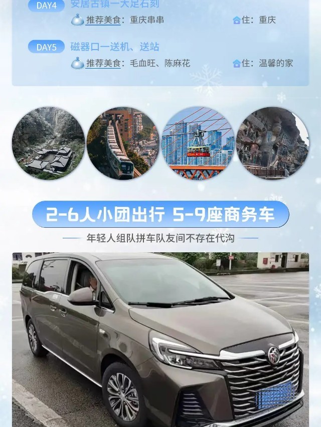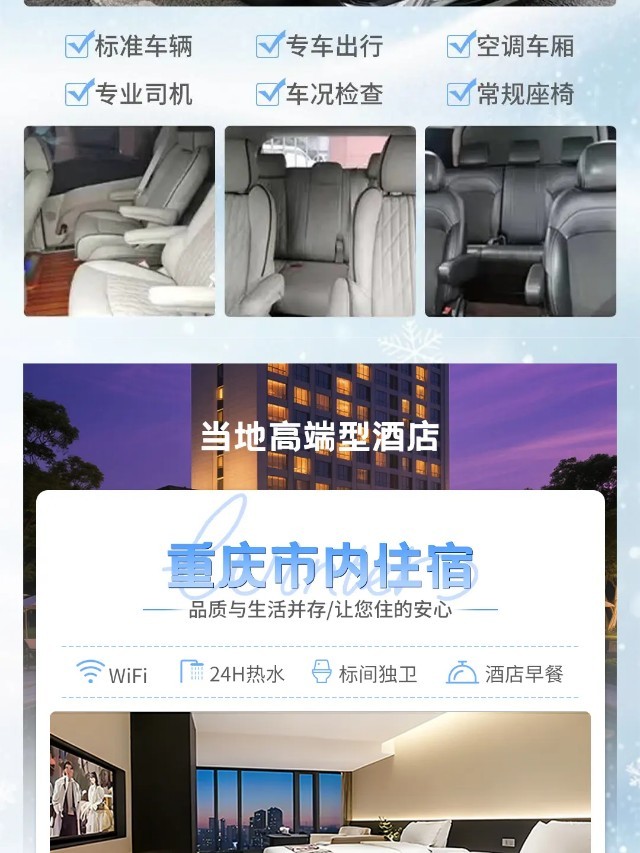 今天是集合日,没有行程安排。大家到达重庆之后,我们会安排专人专车前往机场/车站接大家前往酒店办理入住。随后可以根据时间自行安排行程。