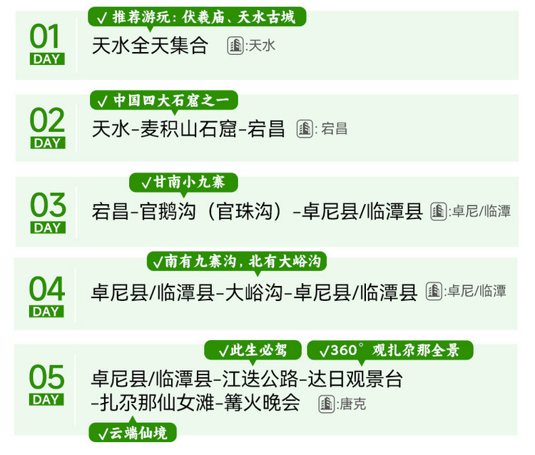 今天为全天集合日,我们相聚在天水,出发前1-3天短信通知集合酒店及领队联系方式。到达酒店向前台报【甘南陇南+姓名】及有效证件入住酒店。